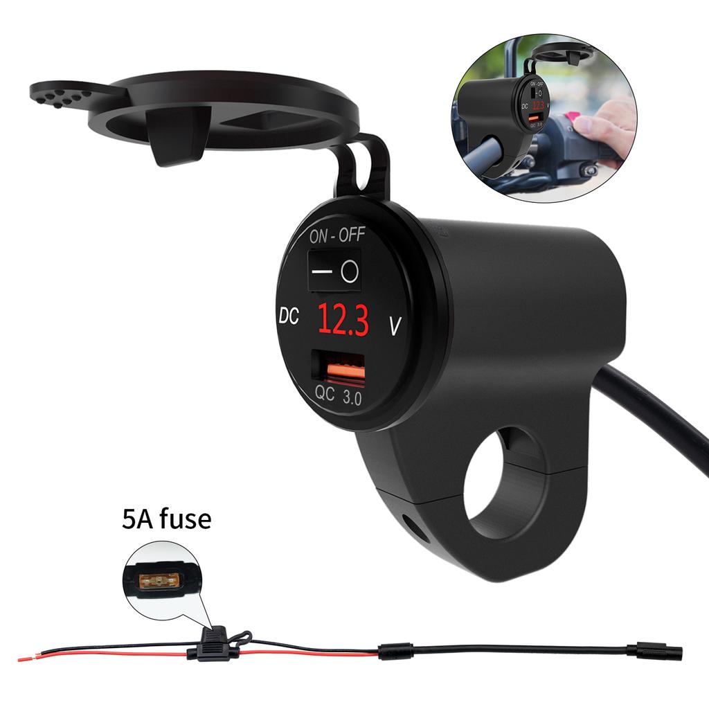 12V Motorcycle Handlebar 2.4A USB Adapter Charger with Digital Voltmeter Fits for 22mm-26mm Handlebars