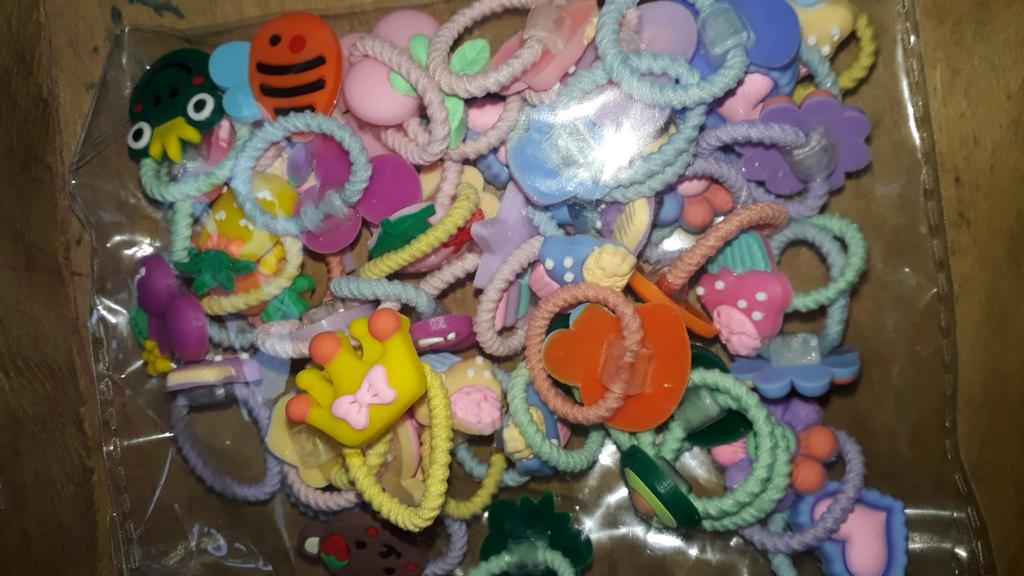 Bright, not bad hair ties. I didn't count how many pieces, but they look like a lot and all in pairs.
