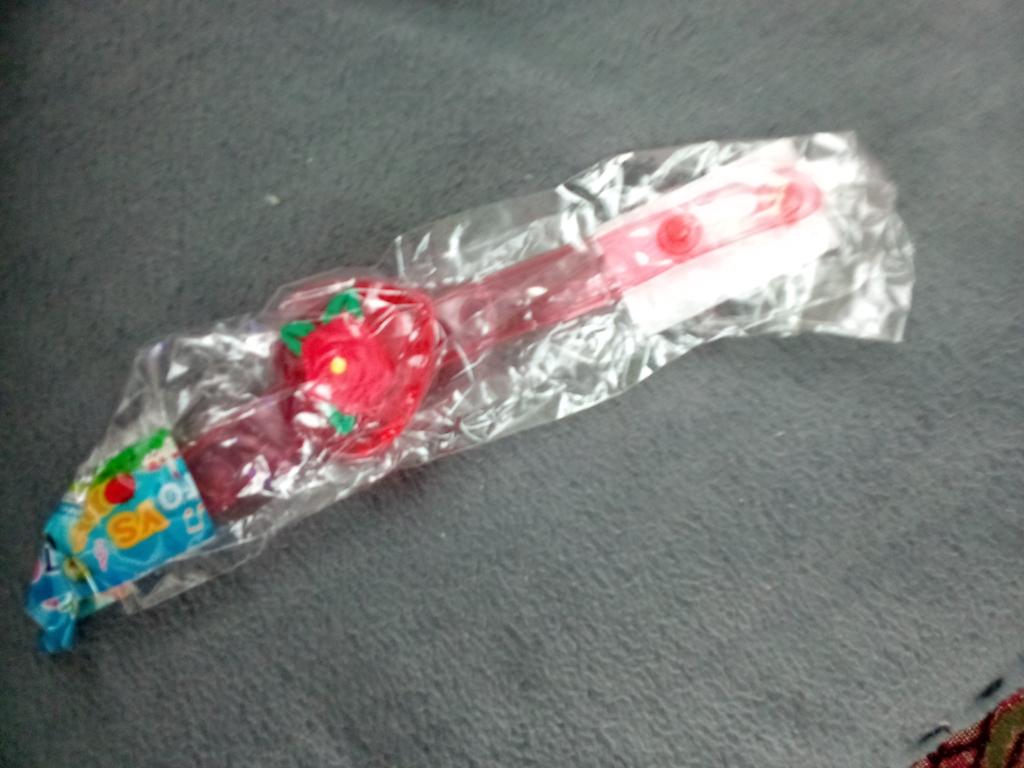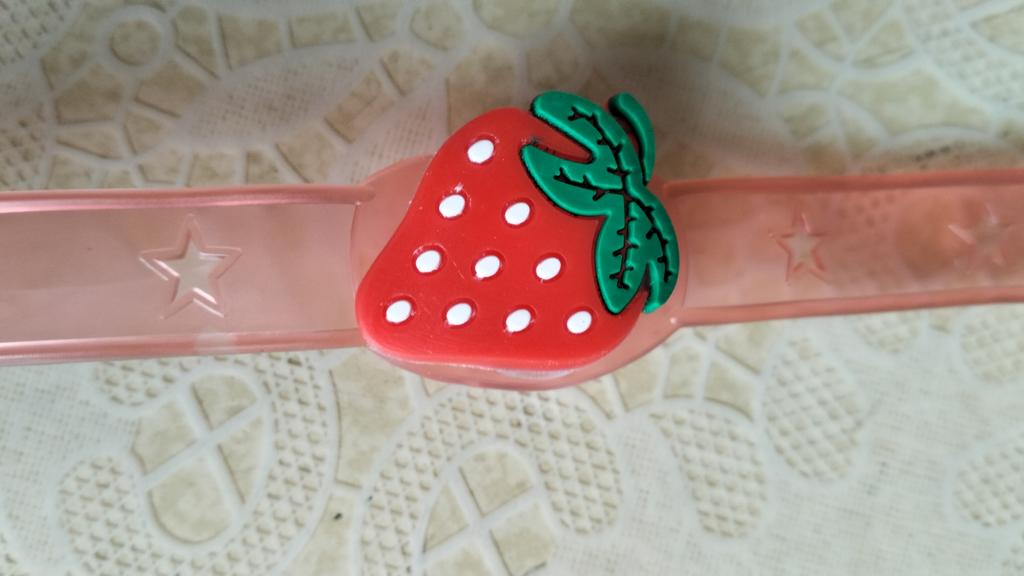 Does not turn on, although batteries are included. The strawberry is soft. The strap is silicone.