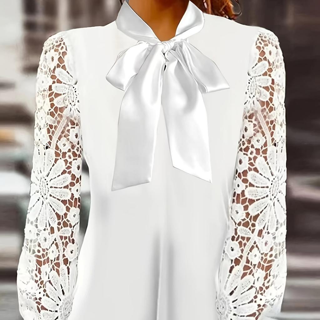 QICED Spring Summer Fashion Women's Lace Lace Sleeves Solid Color Ribbon Satin Shirt