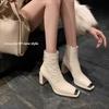 Fashion Women's Boots 2024 New Genuine Leather Square High Heels Zipper Office Ankle Boots Shoes Trendy Fashion