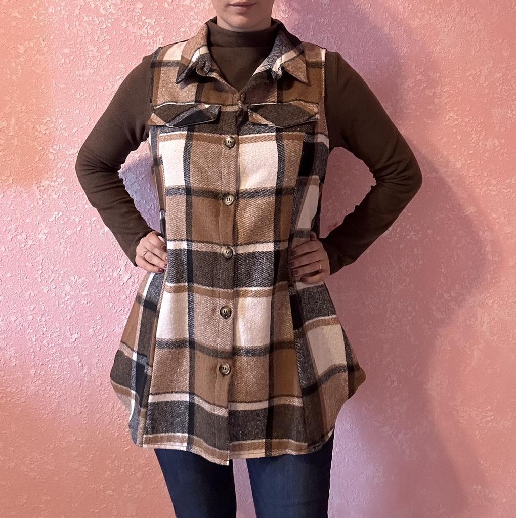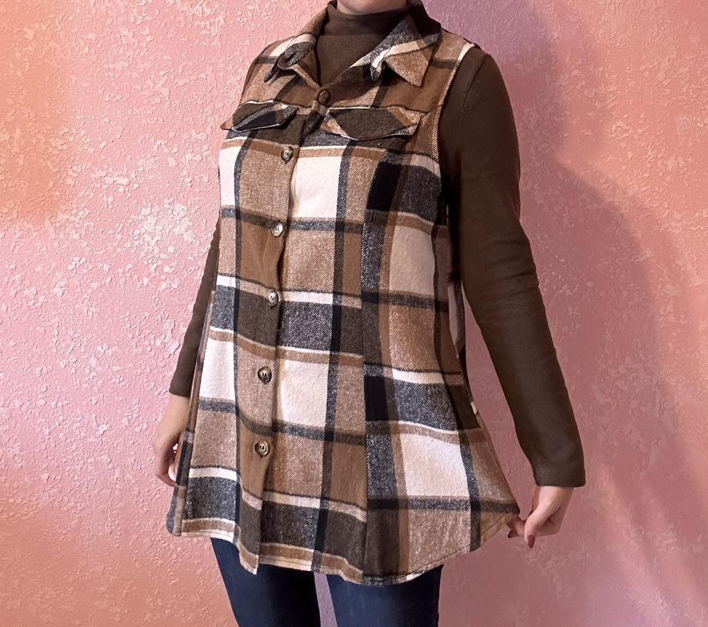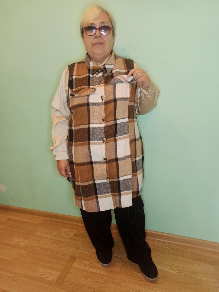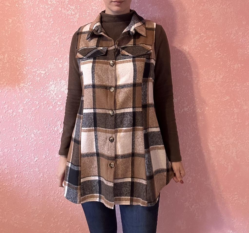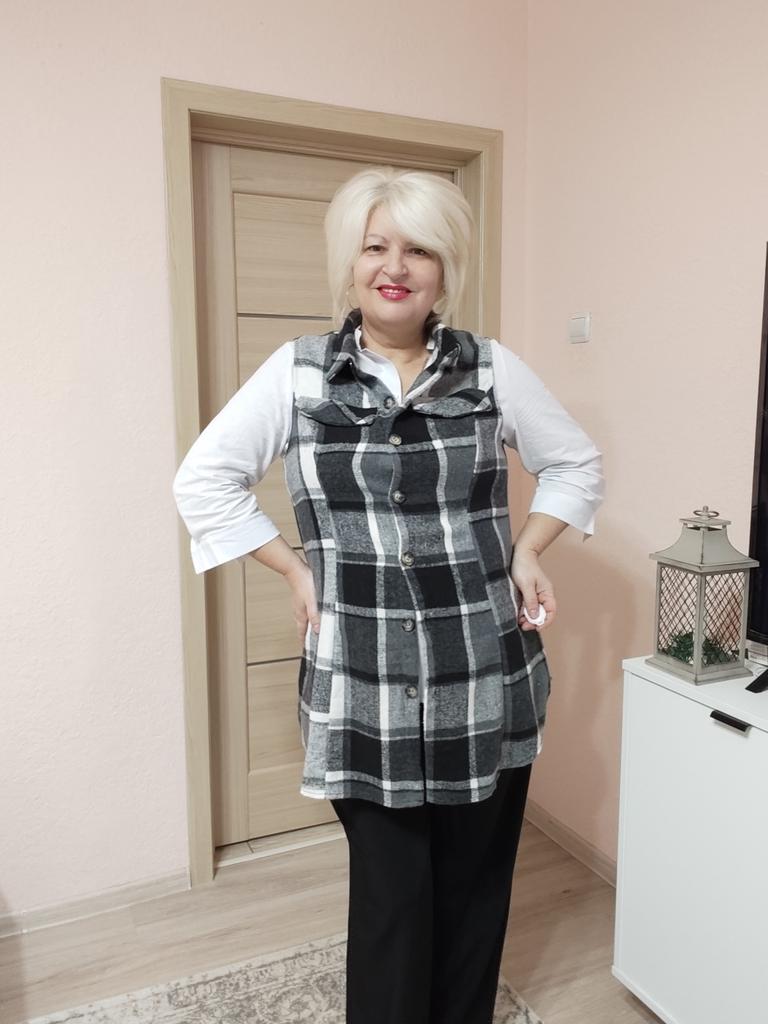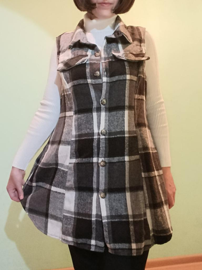 This loose-fitting tweed plaid shirt offers a unique combination of comfort, style, and everyday elegance. It's a garment that exudes a fashionable yet effortless winter-autumn vibe, with a nod to minimalist Japanese-Korean style. It's especially suitable for women who prefer a chic but relaxed look, with a subtle yet clear presence.. The sleeveless design allows for layering flexibility – it can be combined over a thin shirt, a turtleneck, or even a light sweater to create a more sophisticated look. The shirt-style collar and the many buttons down the front add a classic touch, which echoes traditional tweed style but remains updated. The fabric is made of 100% polyester, which makes the item durable, pleasant on the body, and easy to maintain – it can be hand washed. The bra comes in an exceptionally loose and comfortable cut, making it ideal for plus-size women who want to enjoy both fashion and comfort.. In summary, this is a fashionable, versatile, and sophisticated item that enriches any seasonal wardrobe. Perfect for a day at the office, an outing in the city, or simply as a warm and stylish addition to an everyday outfit.