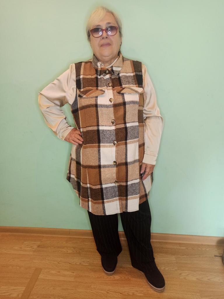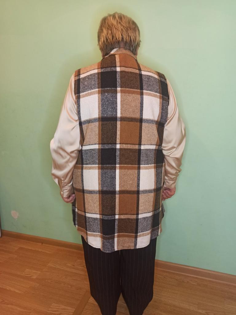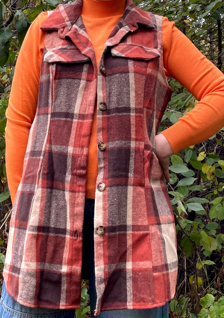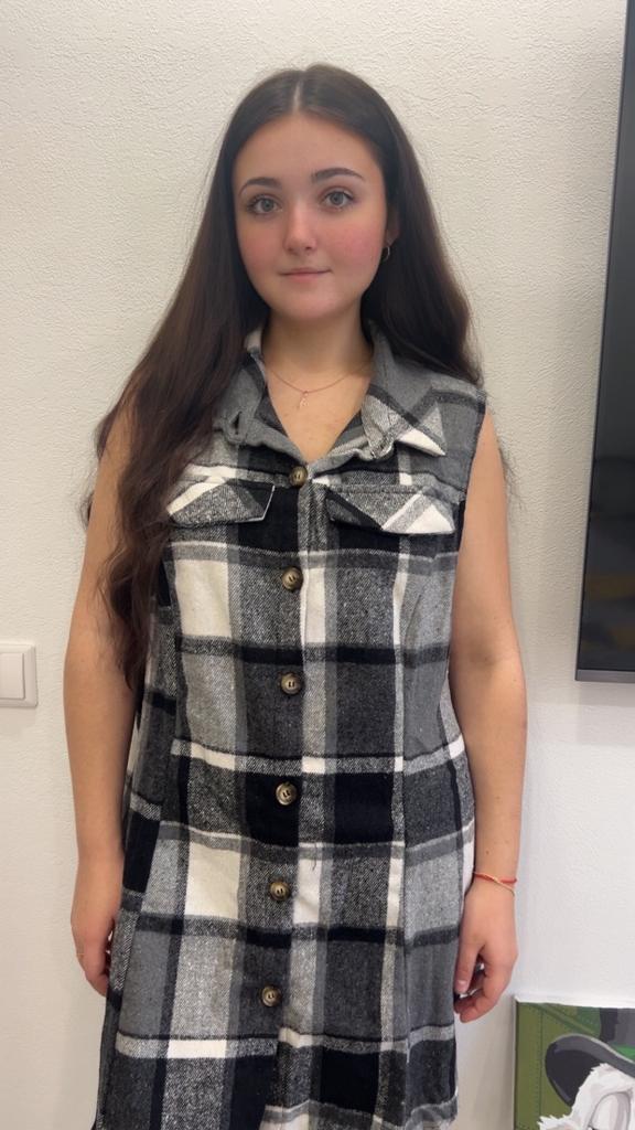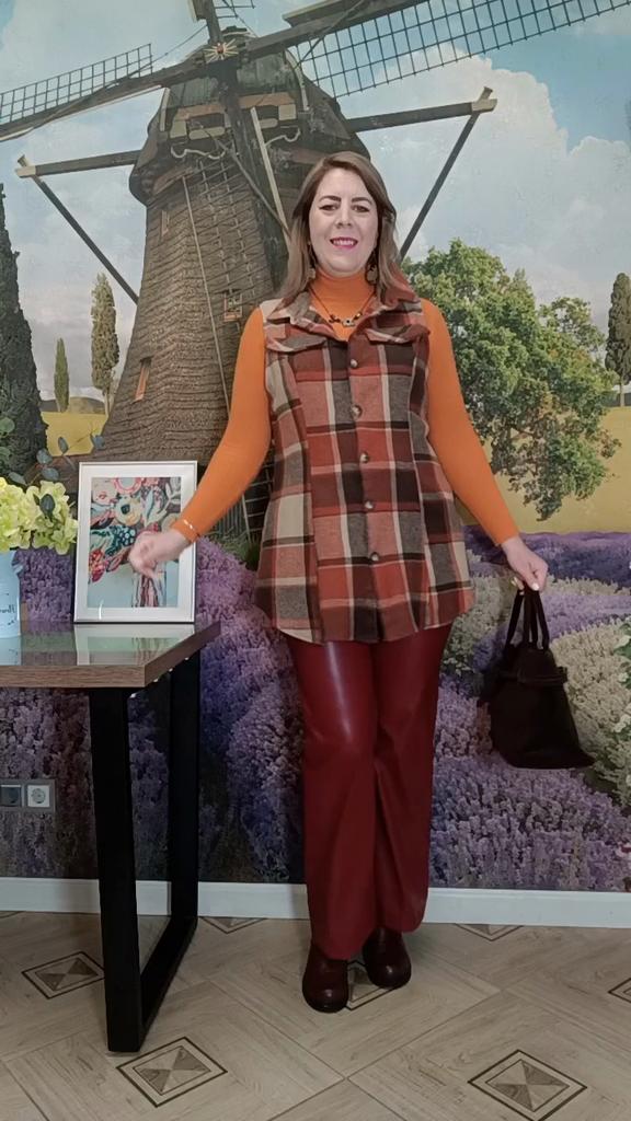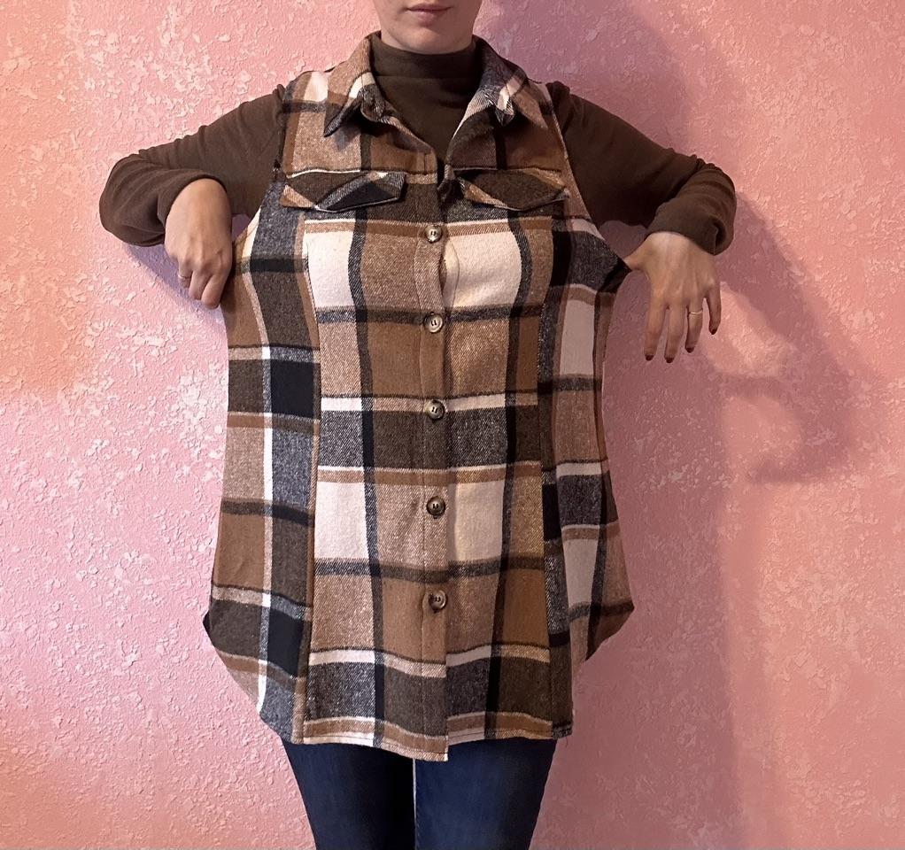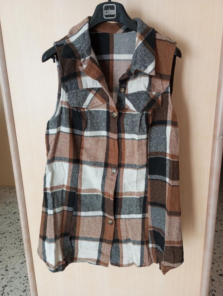 This loose-fitting tweed plaid shirt offers a unique combination of comfort, style, and everyday elegance. It's a garment that exudes a fashionable yet effortless winter-autumn vibe, with a nod to minimalist Japanese-Korean style. It's especially suitable for women who prefer a chic but relaxed look, with a subtle yet clear presence.. The sleeveless design allows for layering flexibility – it can be combined over a thin shirt, a turtleneck, or even a light sweater to create a more sophisticated look. The shirt-style collar and the many buttons down the front add a classic touch, which echoes traditional tweed style but remains updated. The fabric is made of 100% polyester, which makes the item durable, pleasant on the body, and easy to maintain – it can be hand washed. The bra comes in an exceptionally loose and comfortable cut, making it ideal for plus-size women who want to enjoy both fashion and comfort.. In summary, this is a fashionable, versatile, and sophisticated item that enriches any seasonal wardrobe. Perfect for a day at the office, an outing in the city, or simply as a warm and stylish addition to an everyday outfit.