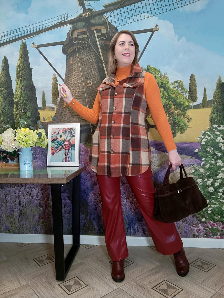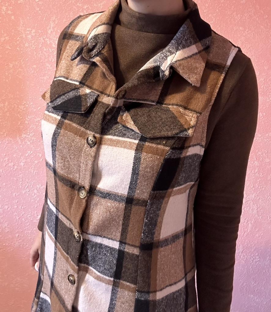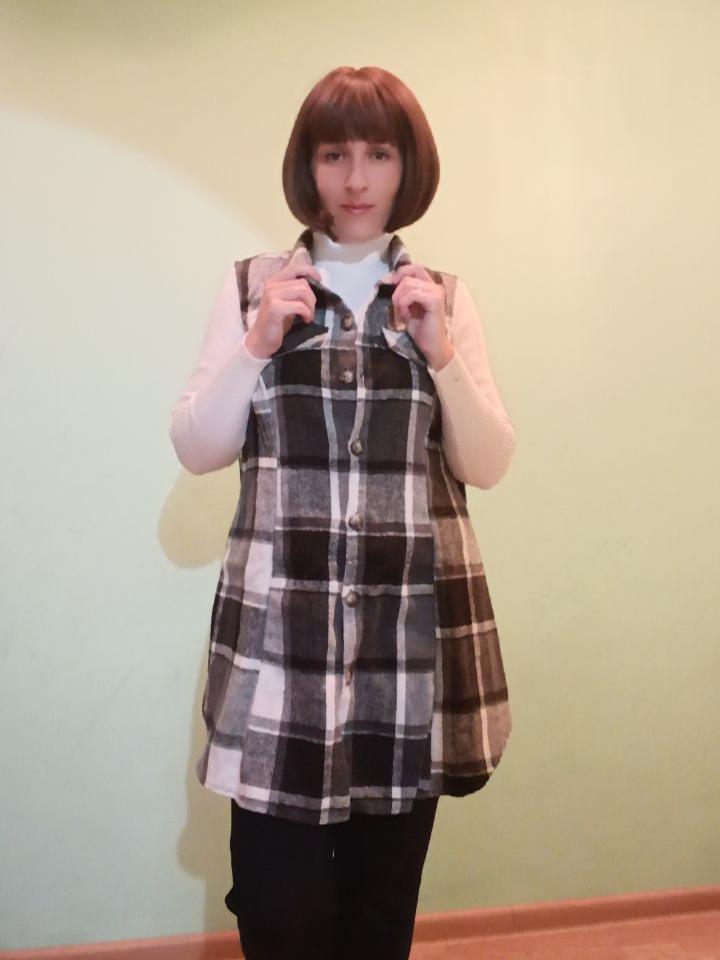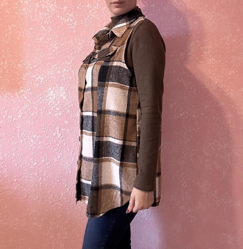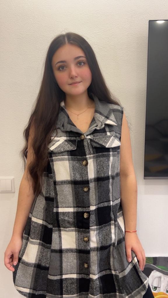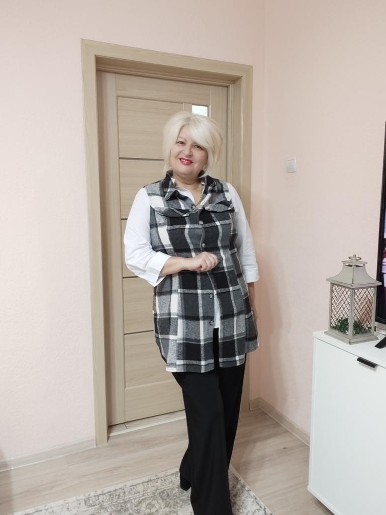 This loose-fitting tweed plaid shirt offers a unique combination of comfort, style, and everyday elegance. It's a garment that exudes a fashionable yet effortless winter-autumn vibe, with a nod to minimalist Japanese-Korean style. It's especially suitable for women who prefer a chic but relaxed look, with a subtle yet clear presence.. The sleeveless design allows for layering flexibility – it can be combined over a thin shirt, a turtleneck, or even a light sweater to create a more sophisticated look. The shirt-style collar and the many buttons down the front add a classic touch, which echoes traditional tweed style but remains updated. The fabric is made of 100% polyester, which makes the item durable, pleasant on the body, and easy to maintain – it can be hand washed. The bra comes in an exceptionally loose and comfortable cut, making it ideal for plus-size women who want to enjoy both fashion and comfort.. In summary, this is a fashionable, versatile, and sophisticated item that enriches any seasonal wardrobe. Perfect for a day at the office, an outing in the city, or simply as a warm and stylish addition to an everyday outfit.
