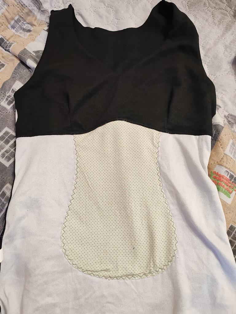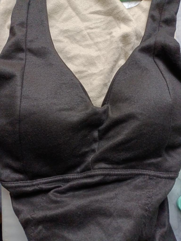 The material is seamless, and that's a plus, as the bust is positioned uncomfortably - higher than my breasts. I had to lengthen the straps by cutting out material...
