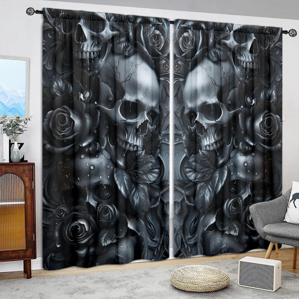 2pcs Terrifying Black Skull and Rose Printed Curtain for Halloween Home Decor - Rod Pocket Window Treatment for Bedroom, Office,
