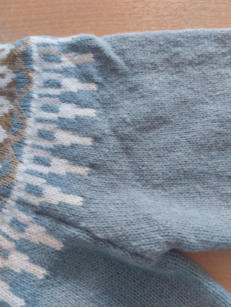 The sweater is cute, but the sleeves are short - 2/3, the collar is sewn from 4 parts - a white collar with blue threads sticking out, and crooked seams, moreover on the front, you can't even cover it with your hair