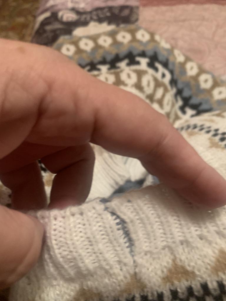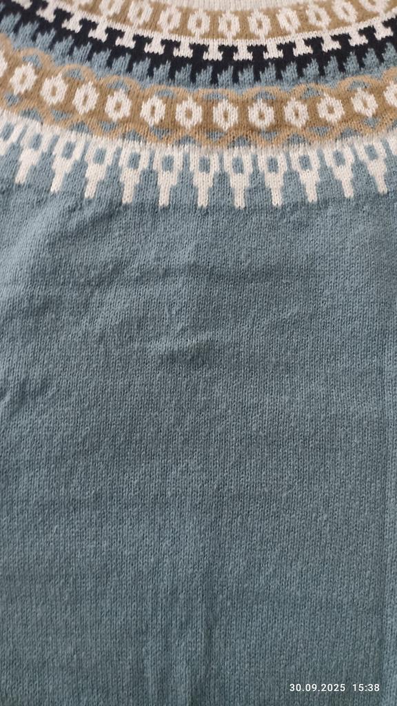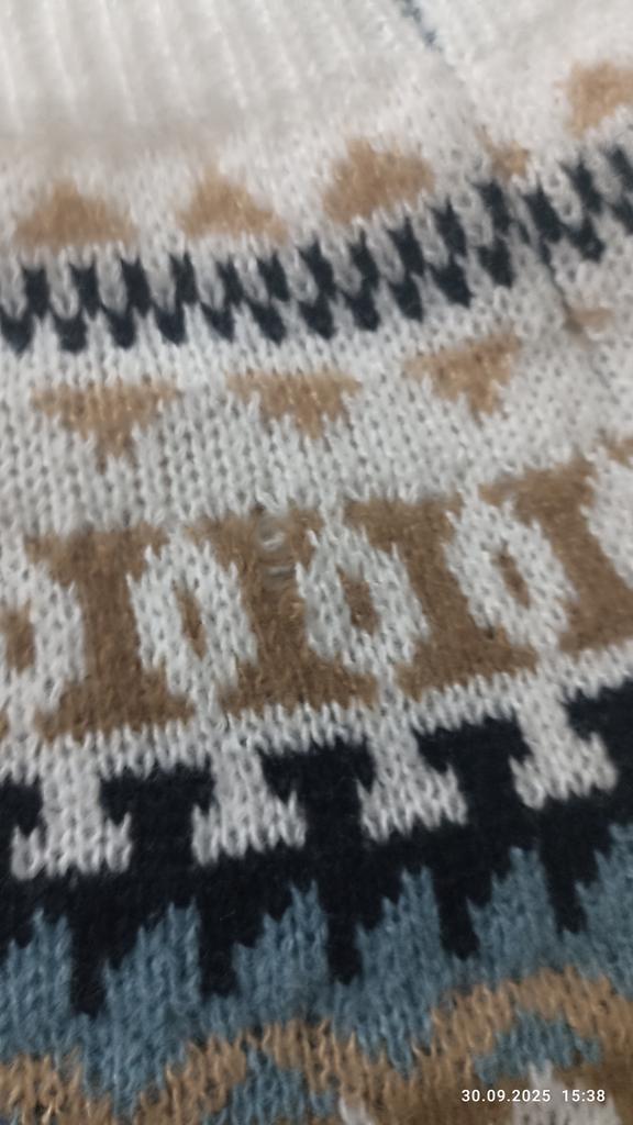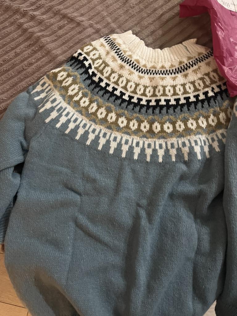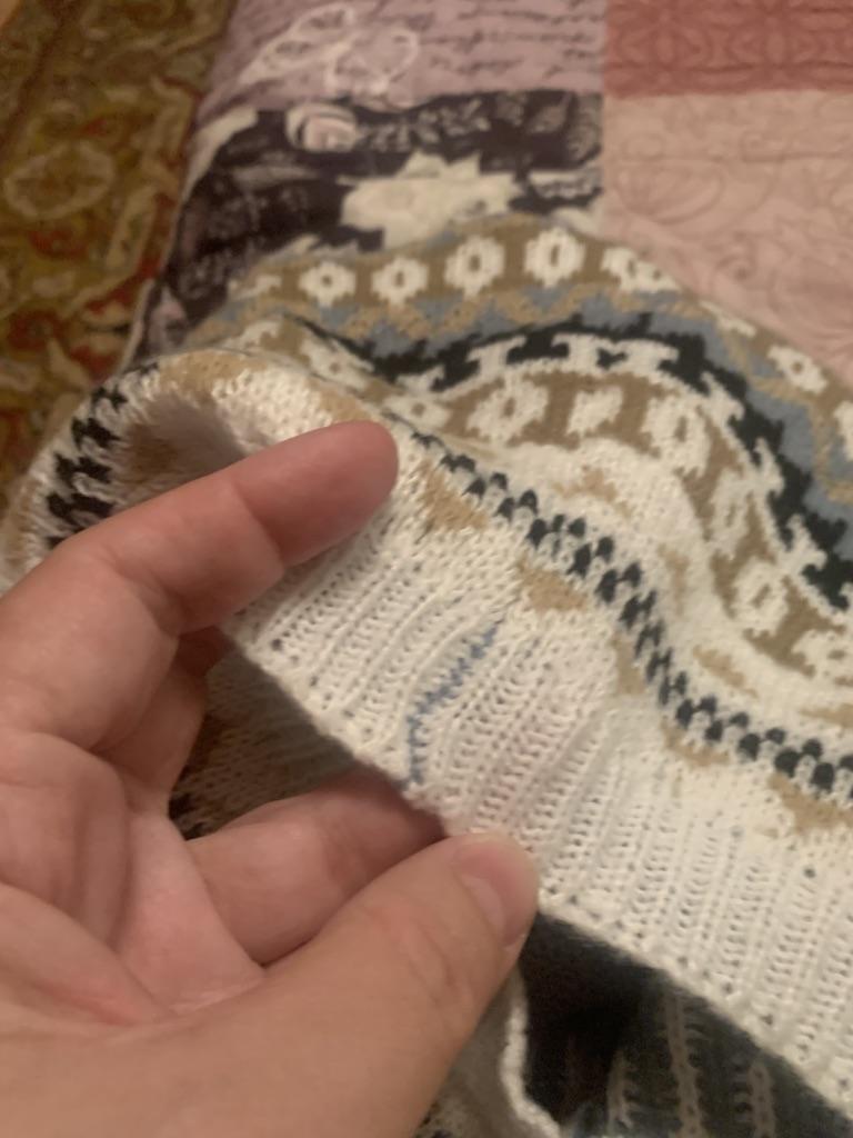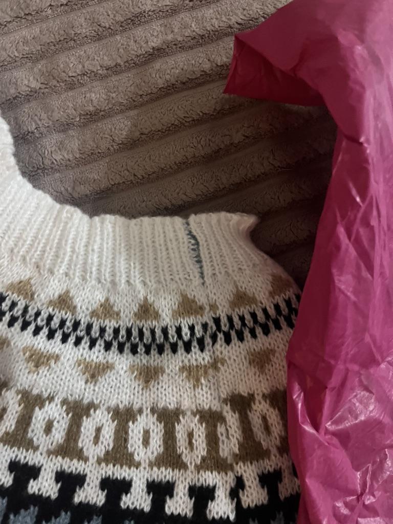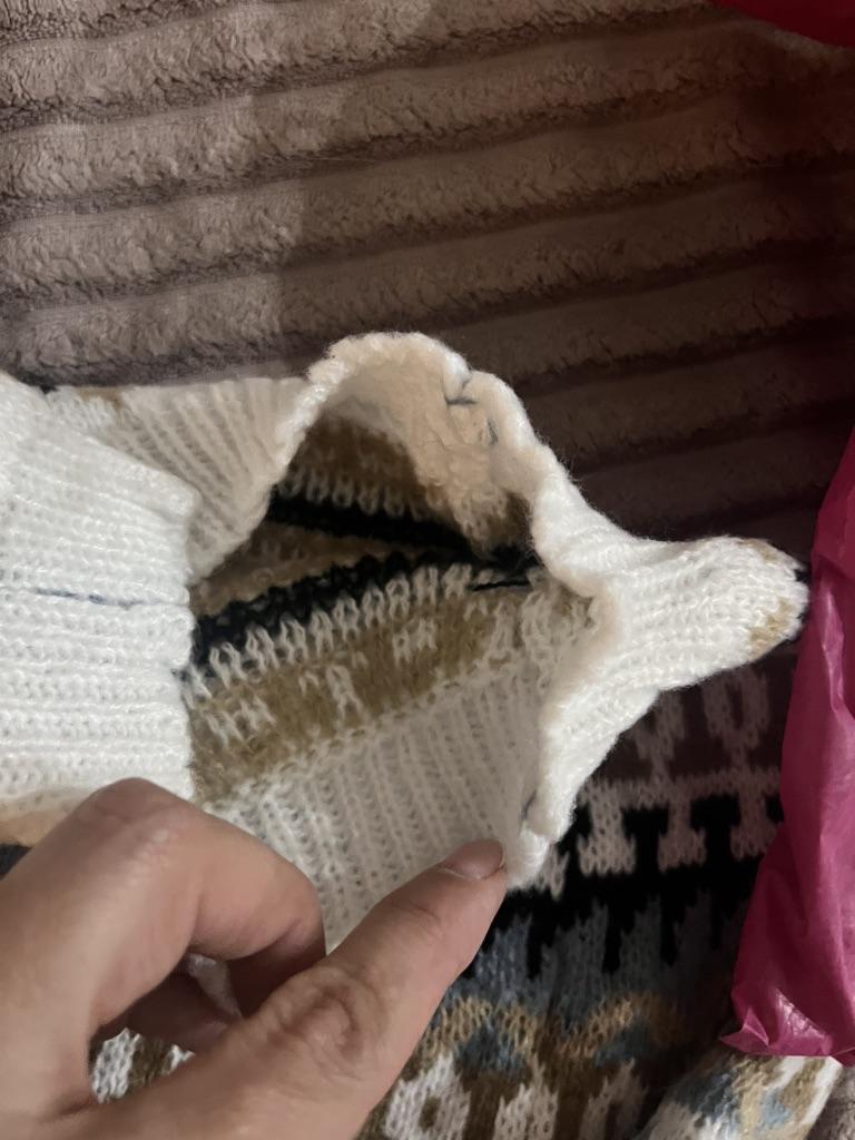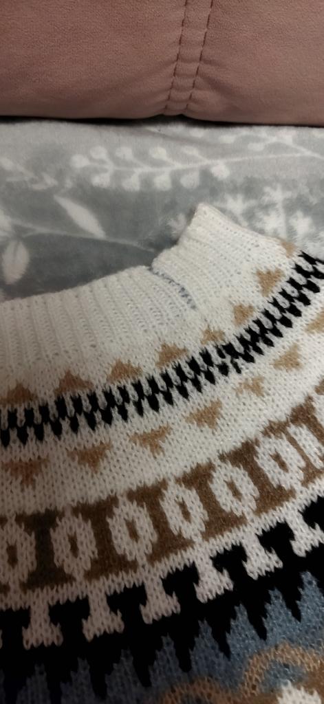 The sweater is not bad, but the neckline is crooked, sticks out, and blue threads are visible on the white neckline. It immediately looks very cheap (((