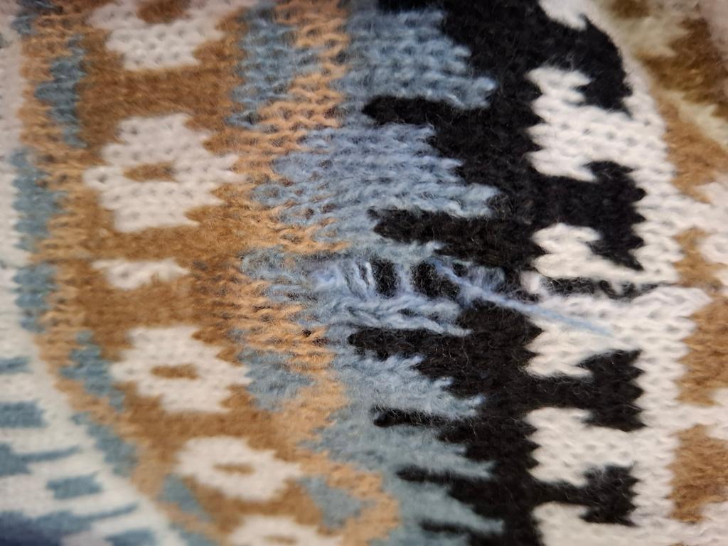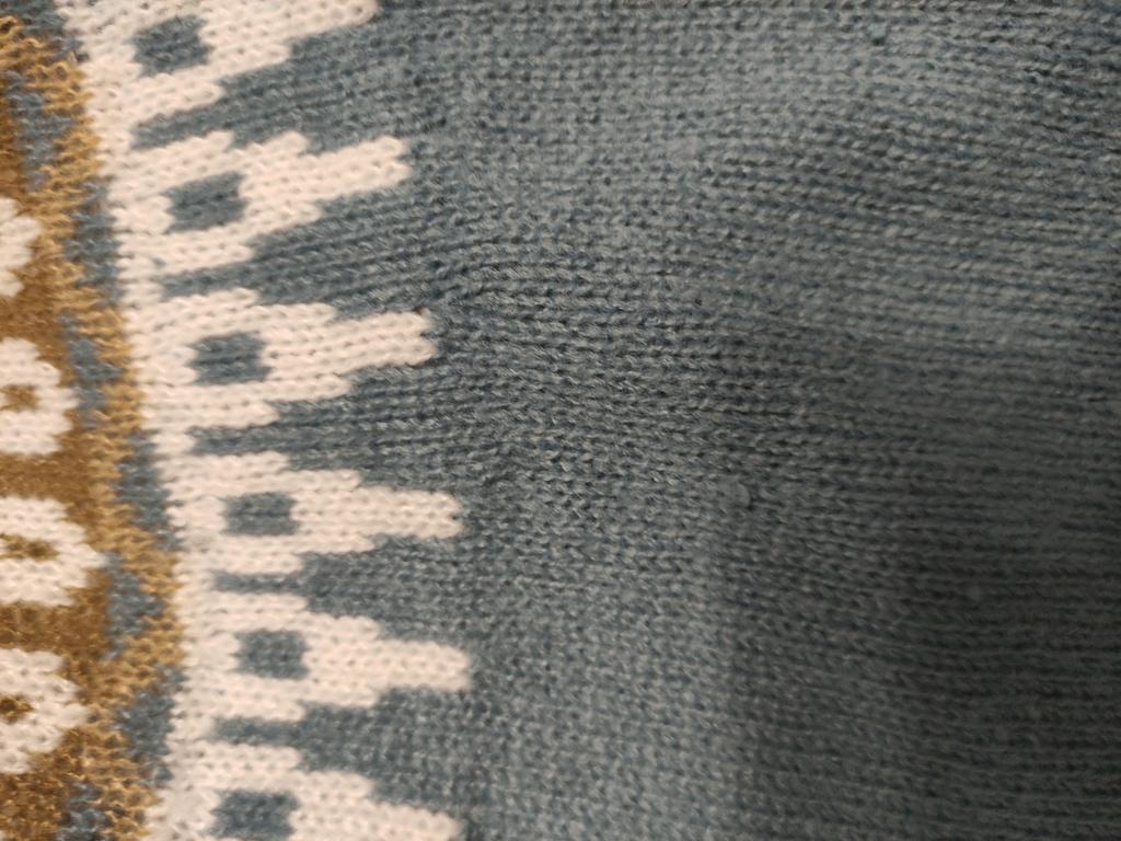 sleeves are 2 cm short; the raglan sleeve seam where the white knitted neckline is at the neck shows blue threads instead of white. i.e. on the white collar there are 4 blue seams (front and back)