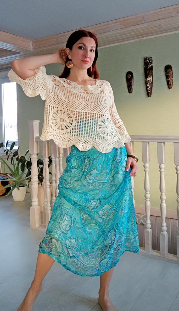 Some kind of awkward, short to the navel, I had to rip the side seams, stretch it, and then wet it and iron it. Stretched it by 15 cm. For some reason the seams are outside, very strange. Why do you need this seam at the waist? In short, I was not delighted, if I saw it in a store, I would not have bought it.
