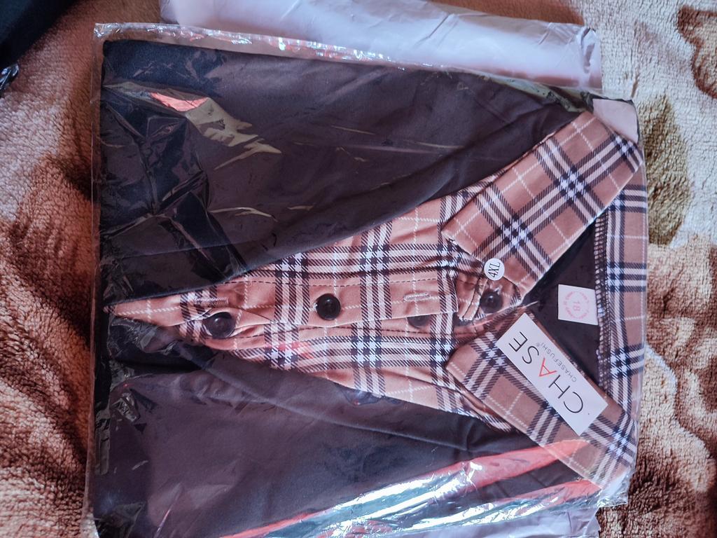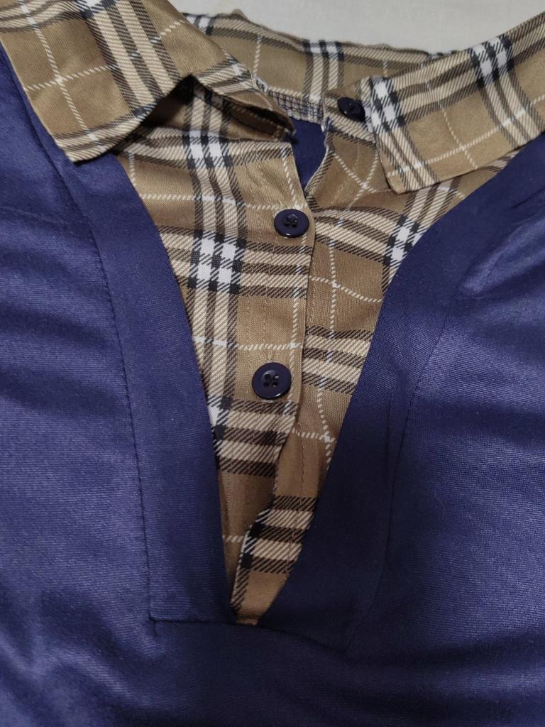 Short blouse and narrow, the tailoring is not very good, threads stick out on the collar, seams are poorly finished