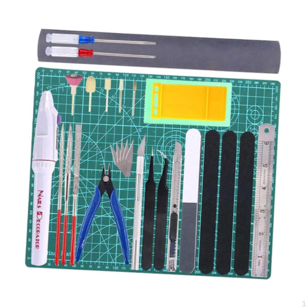 - 【Package Includes】: 1 Mini Grinder with 5 accessories; 3 Steel File Knives; 1 ; 1 Silvery Carving with 5 ; 2 Anti-static Tweezers; 1 Art ; 4 Polishing Files; One15cm Stainless Steel Ruler; A Model Separator; A Velvet Cloth; Two Screwdrivers; Four Sandpapers (500 mesh +1000 mesh +1500 mesh +2000 mesh); A A4 Cutting Mat (22*30 cm). Other tool sizes include Mini Grinder (6.5*1.37 inch), (5 inch), Silvery Carving (5.51*0.28 inch), Screwdriver (5 inch), Anti-static Tweezers (4.8/5.3 inch)