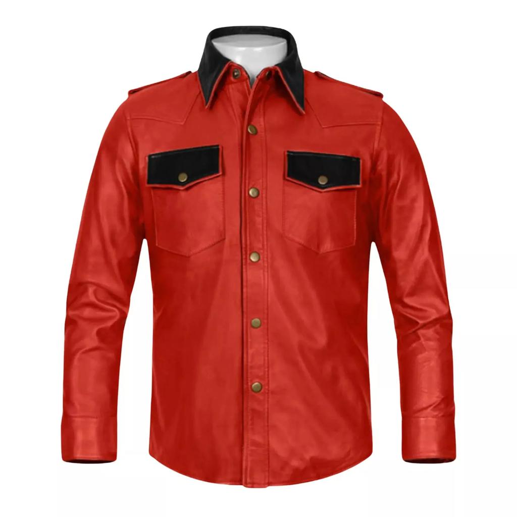 Men's Red Leather Shirt Real Soft Lambskin Handmade Stylish Casual Biker Outdoor