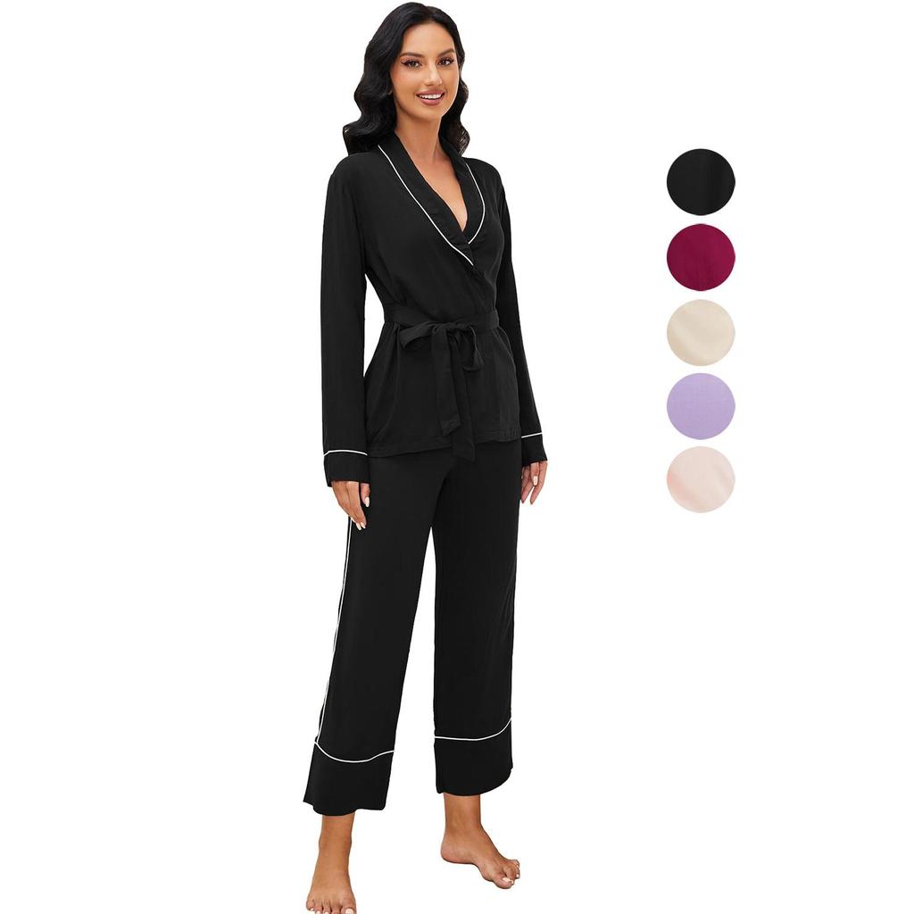 --RELAXED LACE UP STYLE - Women's two-piece solid color PJs feature stylish lace up TOP, Full-length pants have an ELASTIC waist