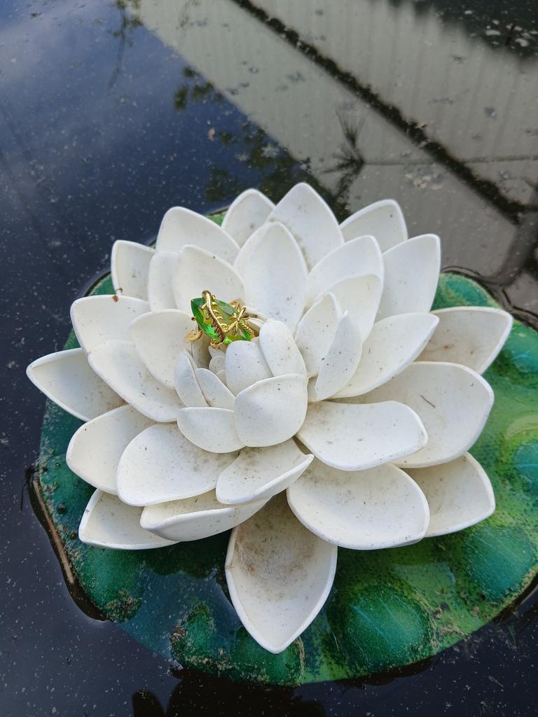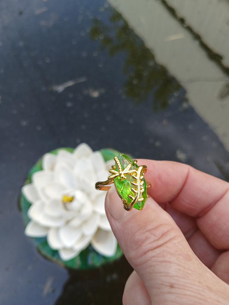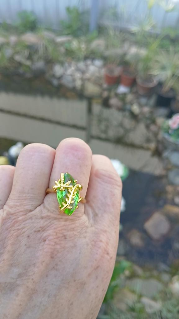 The ring is beautiful, but the color in the picture is more like a sea wave, but in reality it is bright green and the metal is also yellow.