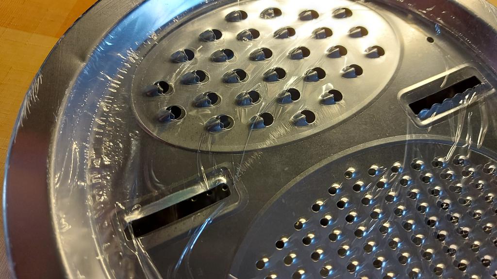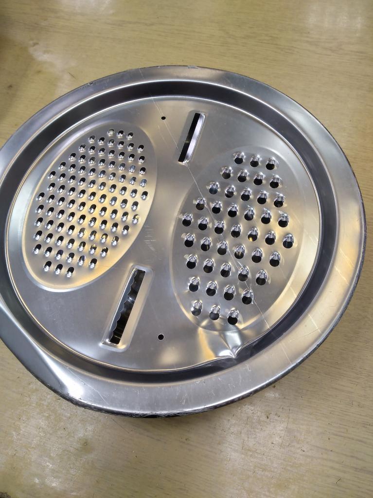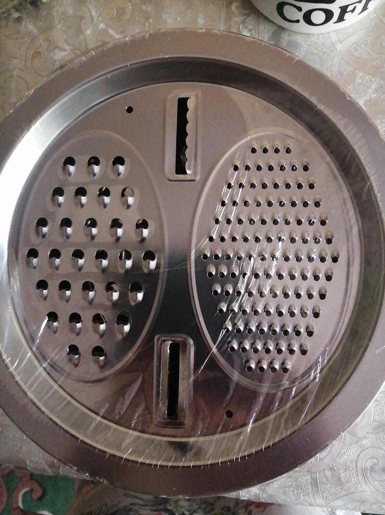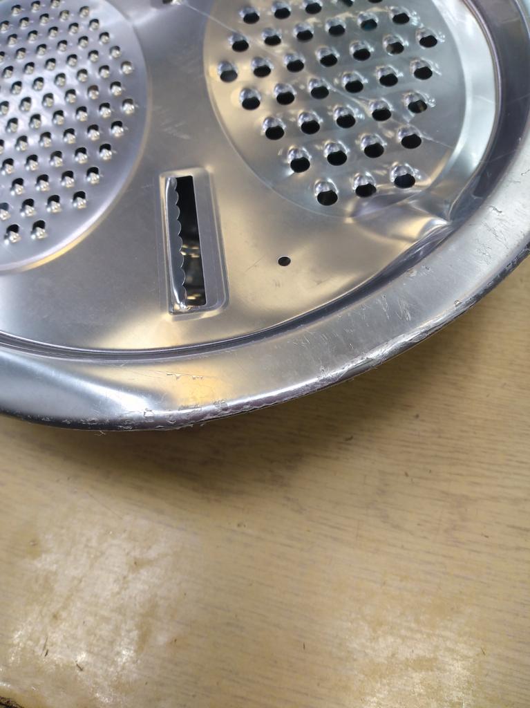 There are dents from fingers and on the bottom of the cup. The material itself is dusted tin, it is dangerous to work with a grater, it grates poorly, and you can hurt your fingers because of this. I did not like the quality of the product. I want to send pictures, but the application does not allow you to send photos.