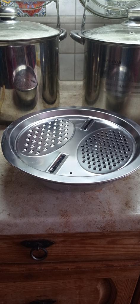 the grater looks solid and has a colander, larger than this blue strainer, and the strainer fits a pot with a diameter of 26cm