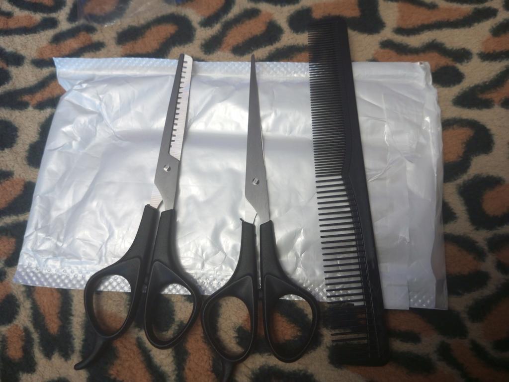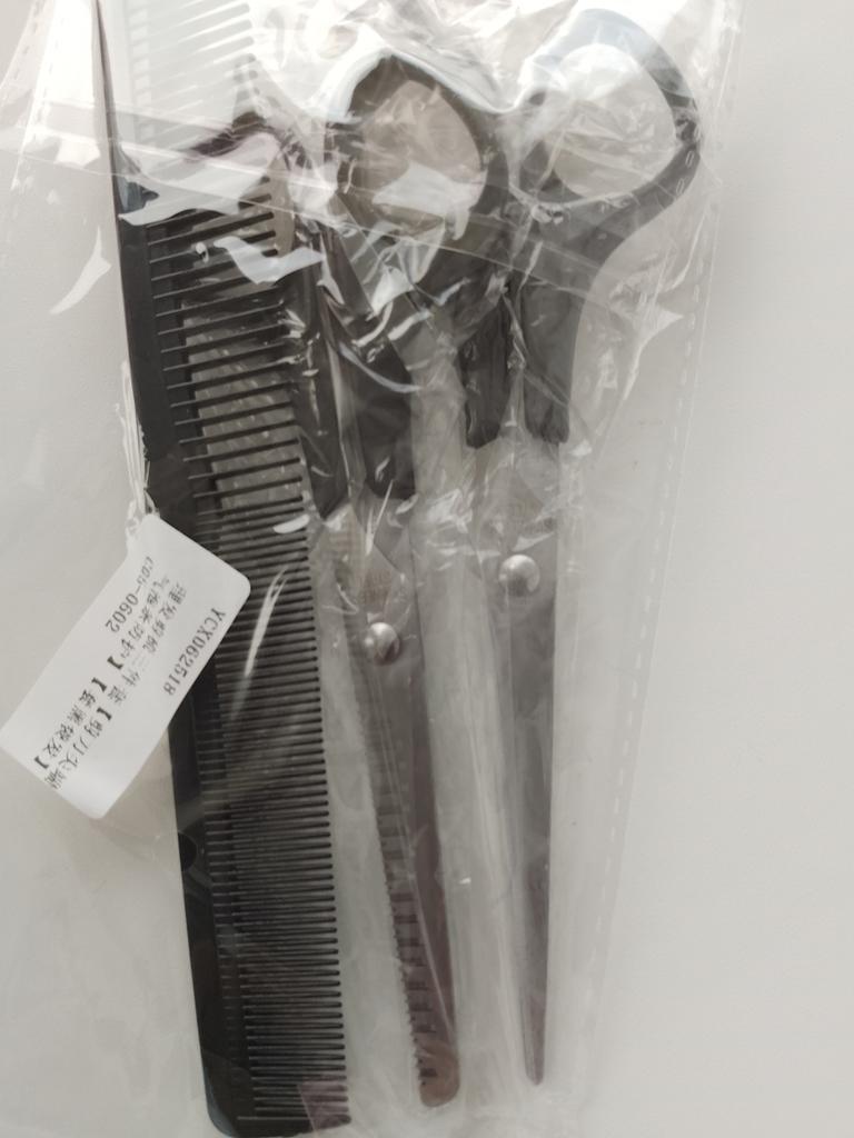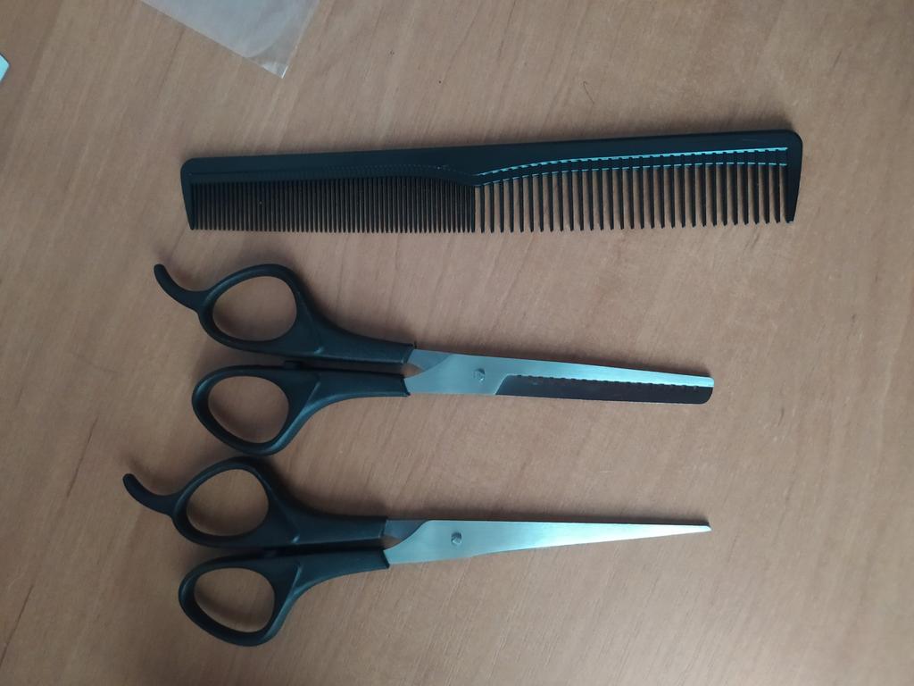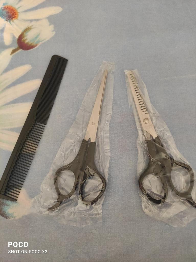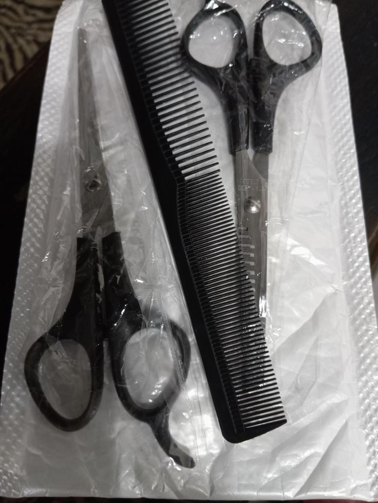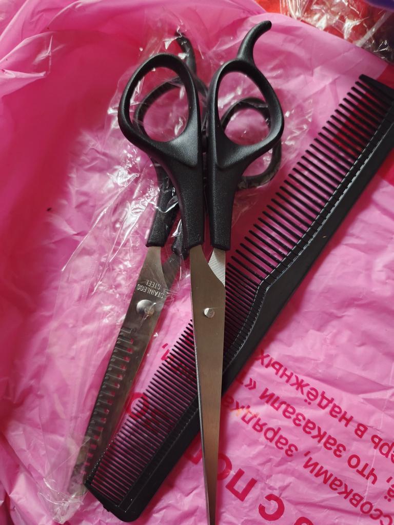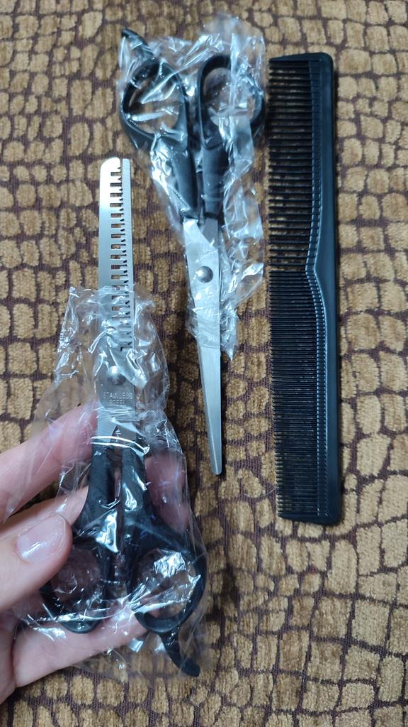 Received the set: 2 pcs. scissors + comb. Haven't tried it yet.