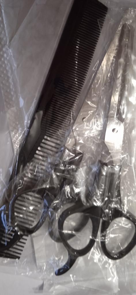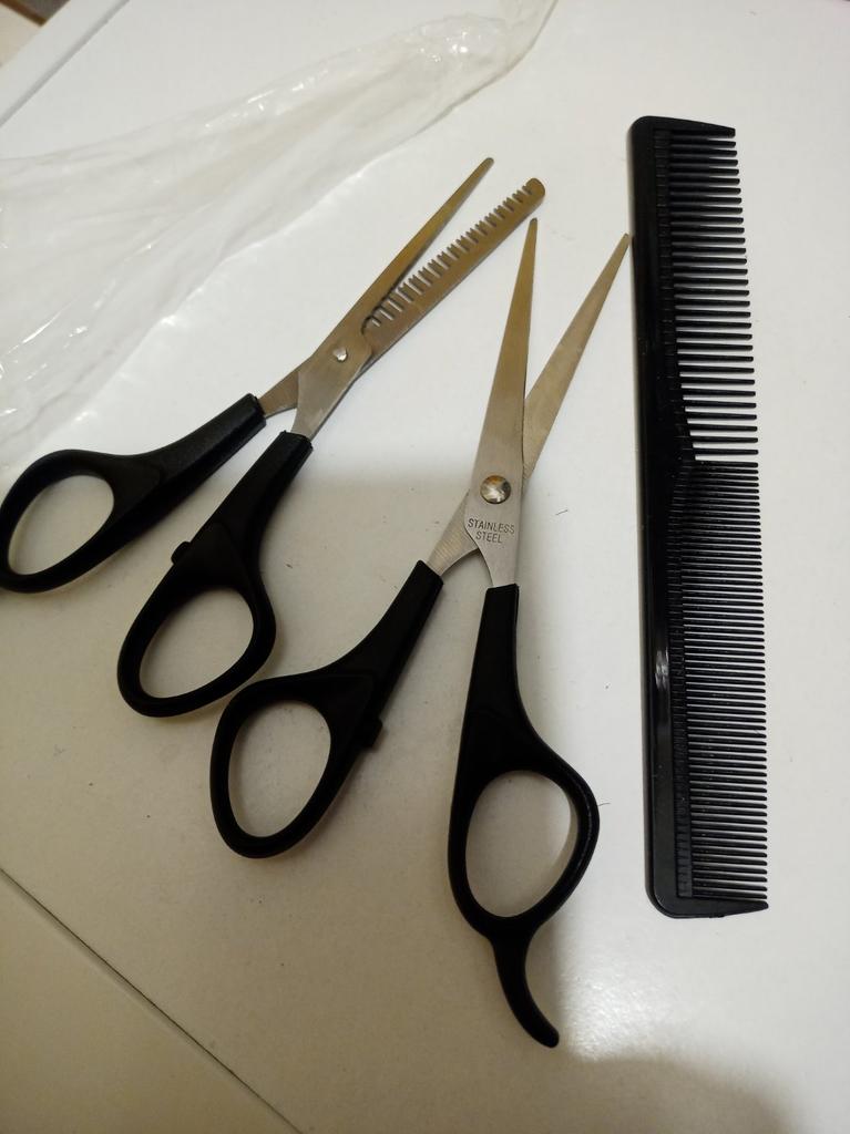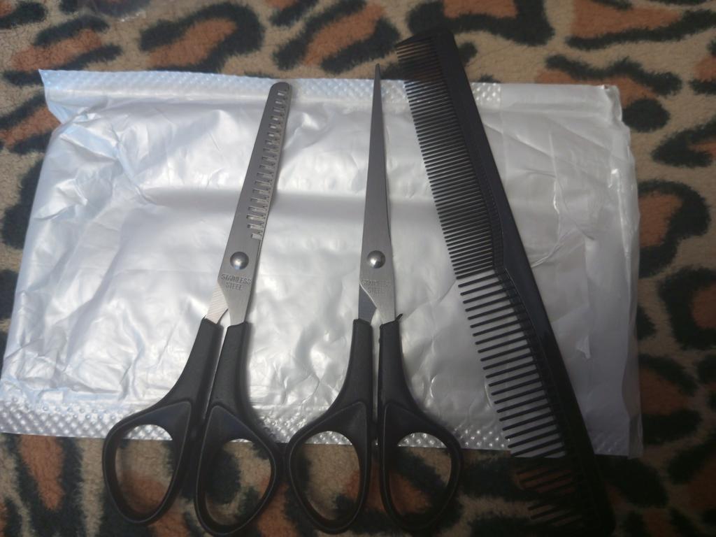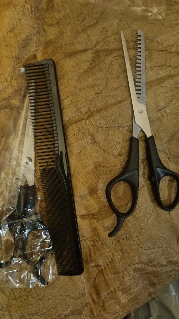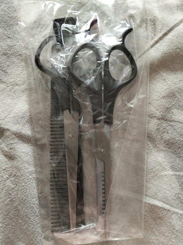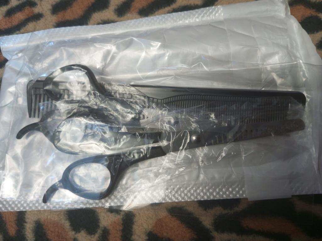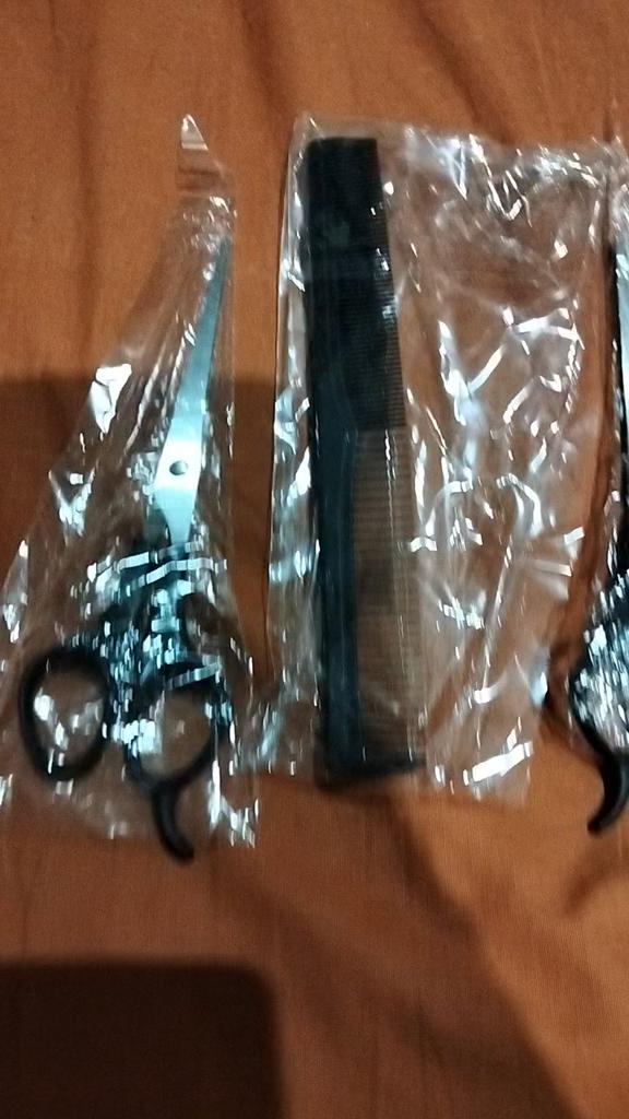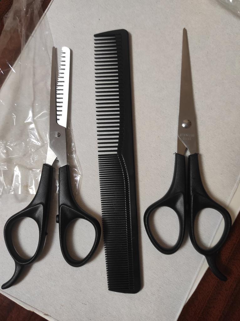 Received the set: 2 pcs. scissors + comb. Haven't tried it yet.