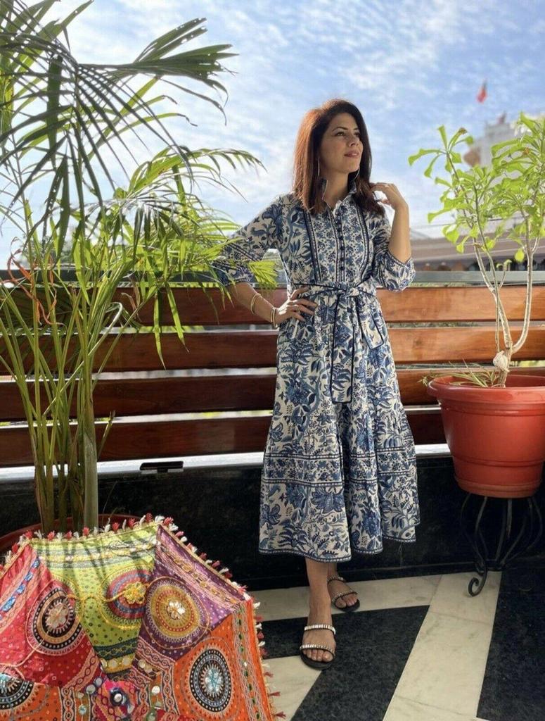 HandBlock Print Dress Jaipur Morni Cotton Summer Midi Dress Blue Cotton Shirt Dress with Belt,pockets