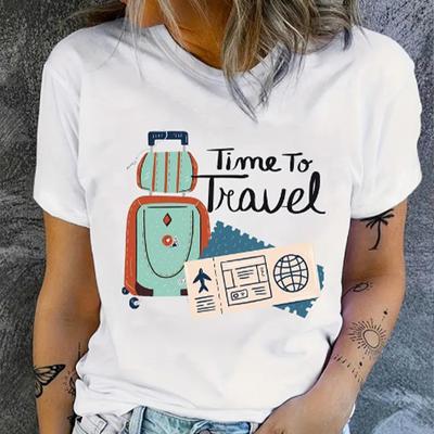 Travel Pattern Printed T-Shirt, Spring/Summer Casual Round Neck Short Sleeved Top Women'S Clothing, Fashionable Painted Clothing