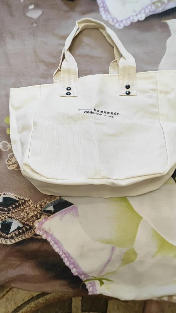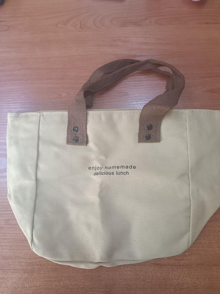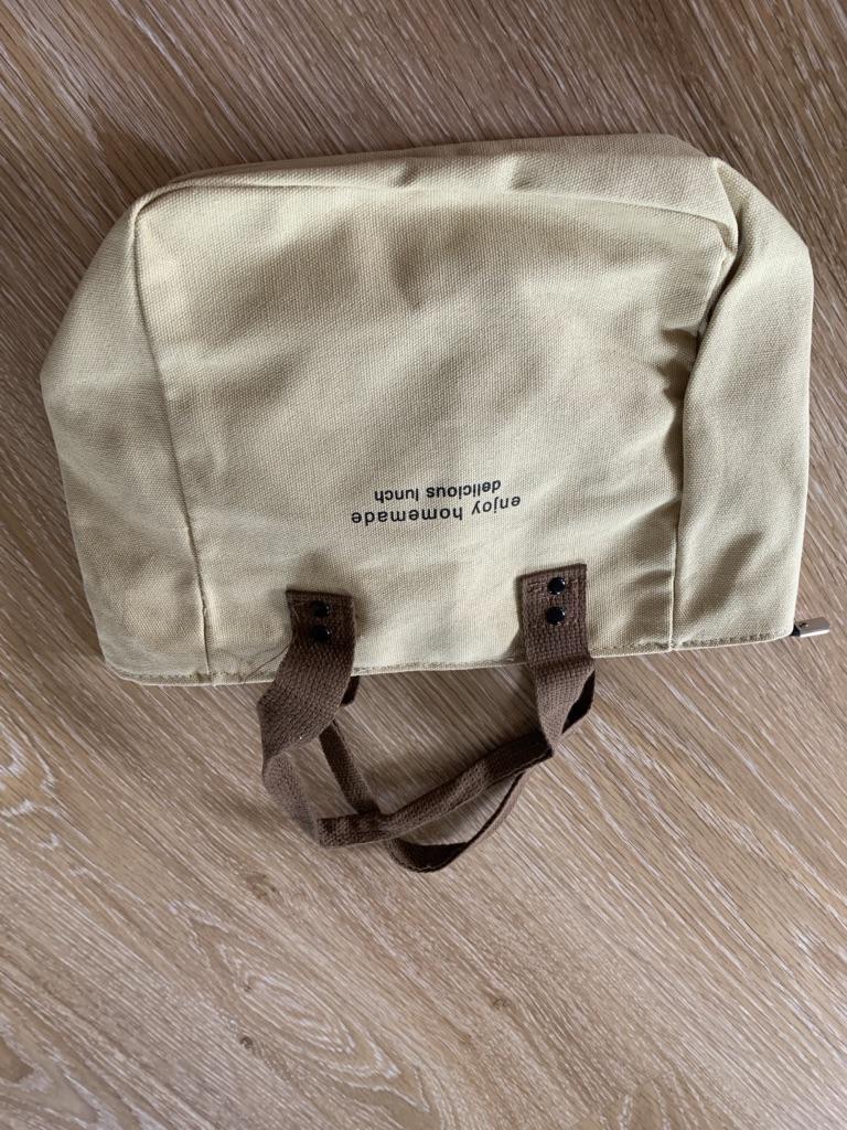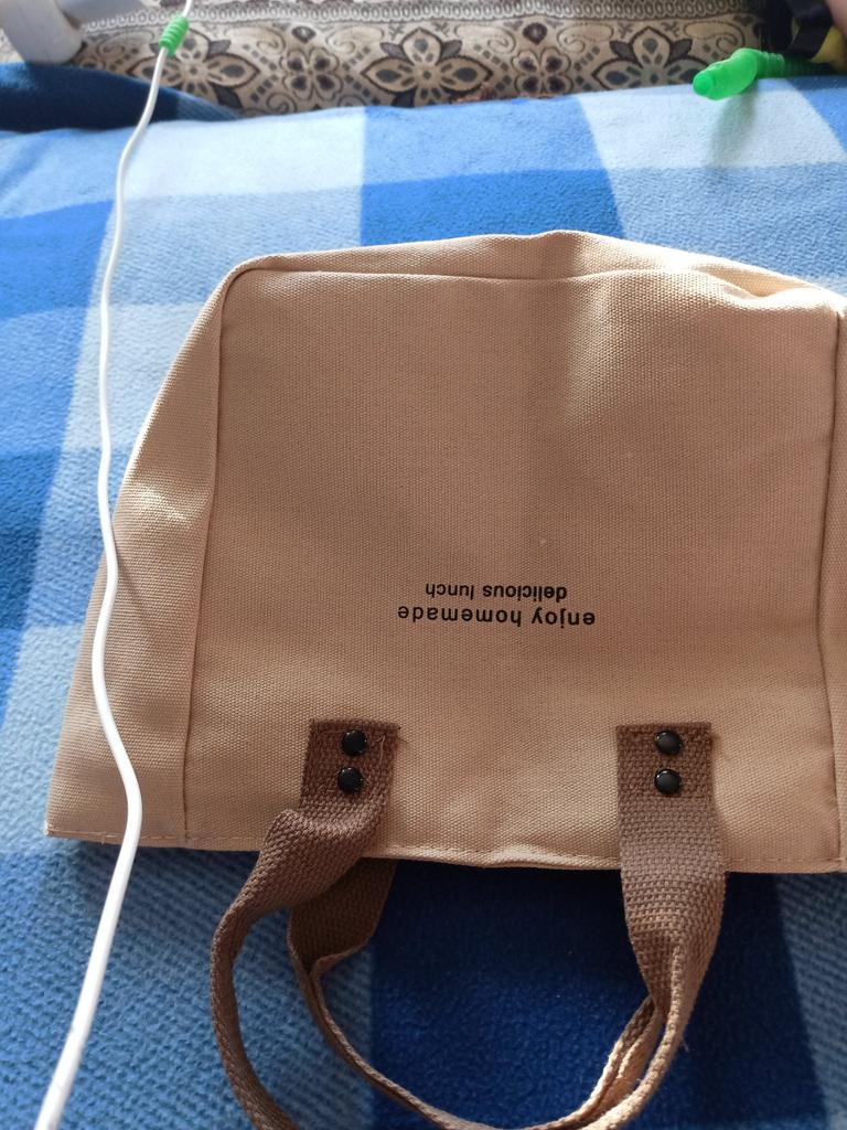 Small, cloth handbag, a lunch box fits.