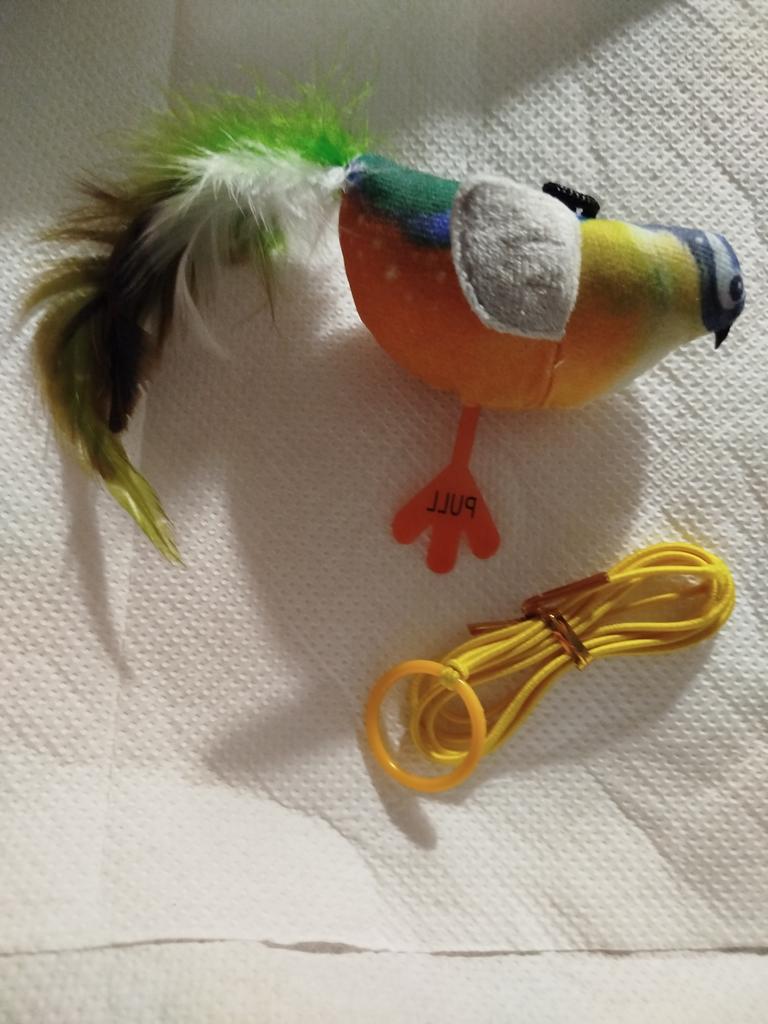 A singing bird that is attached to an elastic band and can also be launched, out of competition.