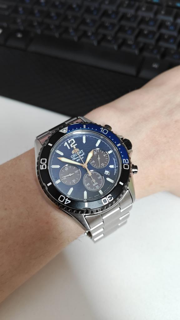 Beautiful solar-powered diver chronograph. Looks very cool on the wrist. The color and texture of the dial are just super - like a piece of the ocean depths on your hand. Lightweight and look quite compact.