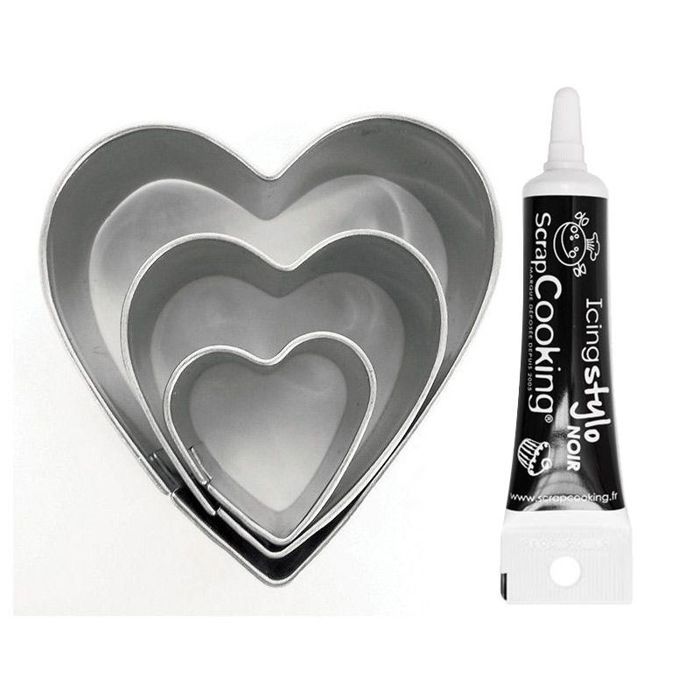 3 mini emporte-pièces inox Coeurs + Stylo de glaçage noir
