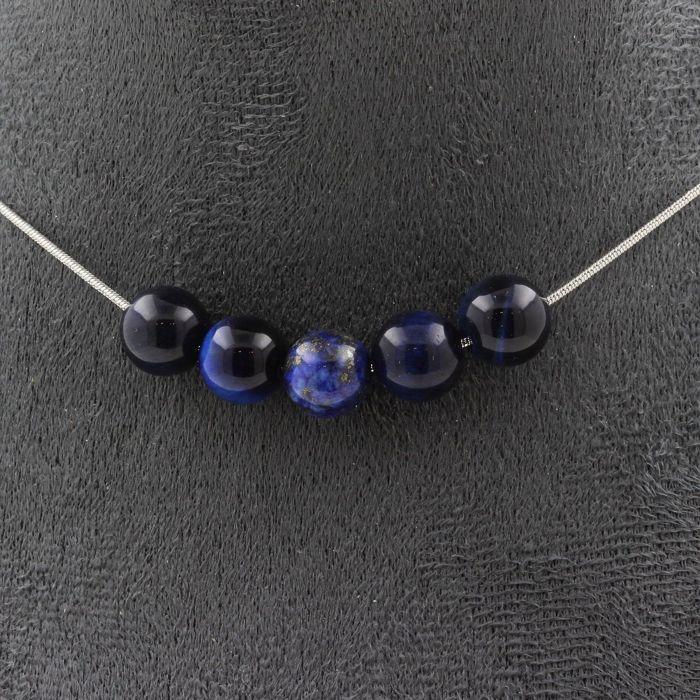 Stones and Minerals. 5-bead Blue Tiger Eye Necklace 8 Mm. Stainless Steel Chain Necklace Women Men. Custom Size