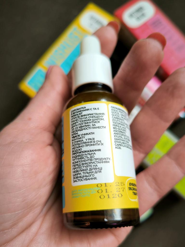- SERUM WITH VITAMINS C AND E WiSHLiST VITAMIN C & E, 30 ML for protection and radiance! Vitamins C and E act as powerful antioxidants, neutralizing free radicals, protecting the skin from premature aging and pollution.. Vitamin C brightens skin tone, giving it a natural glow.
