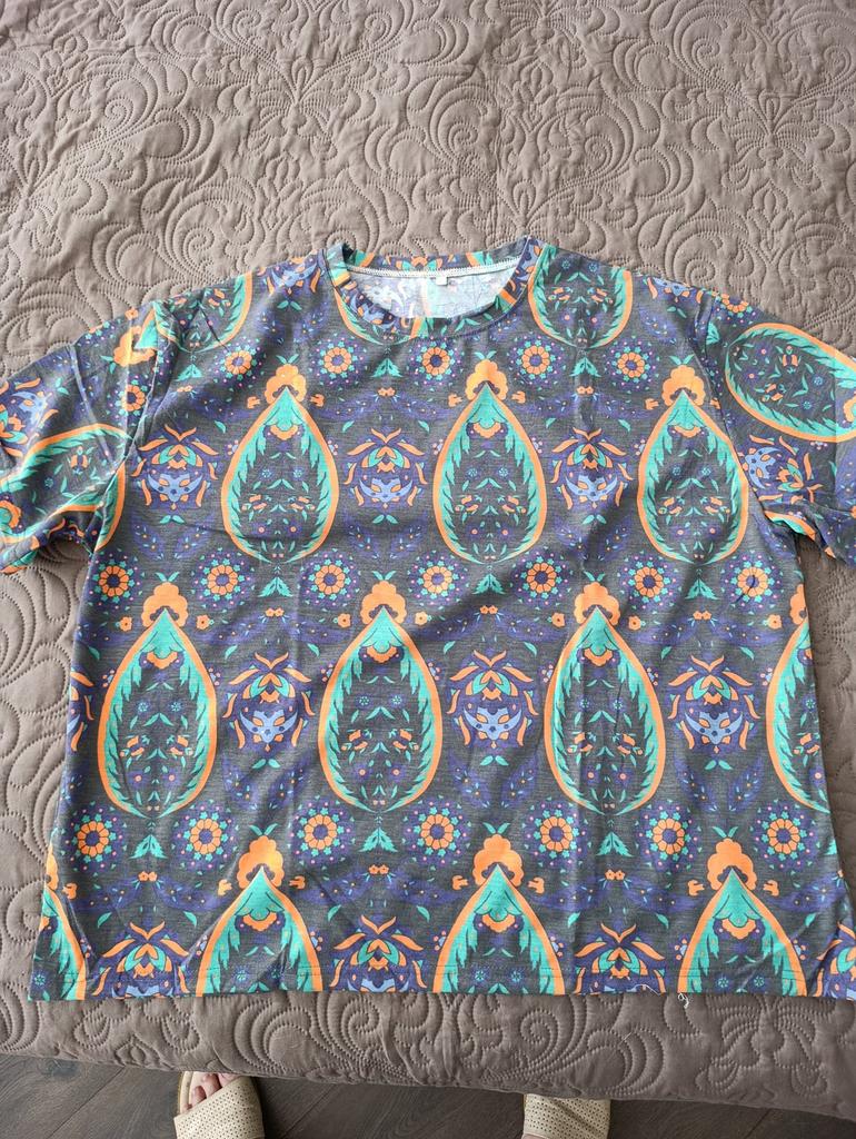 The t-shirt is beautiful, but runs small, even though according to the size chart it should be a bit big.