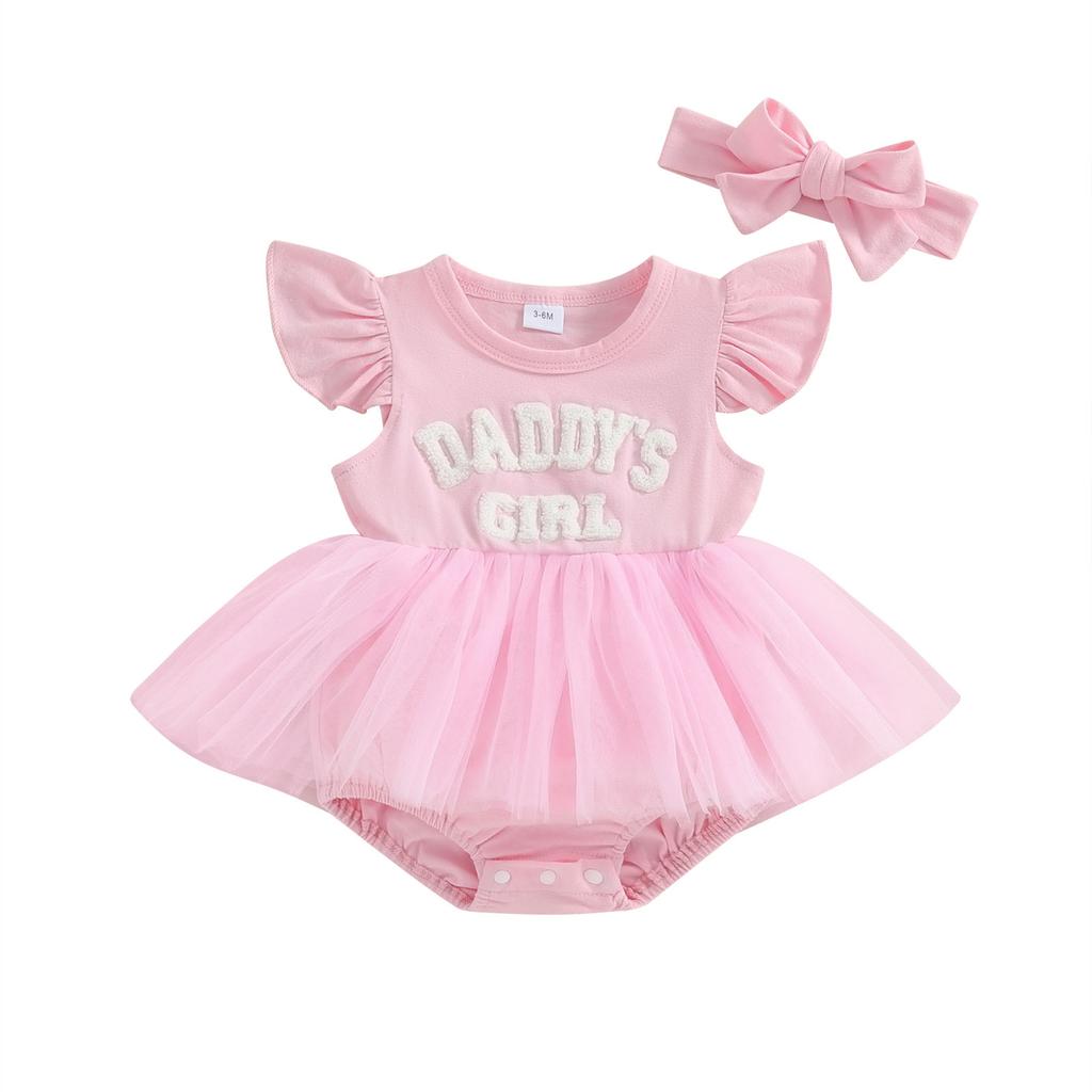 Baby Girl 2 Piece Outfits Letter Embroidery Mesh Romper Dress and Headband Cute Fashion Summer Clothes