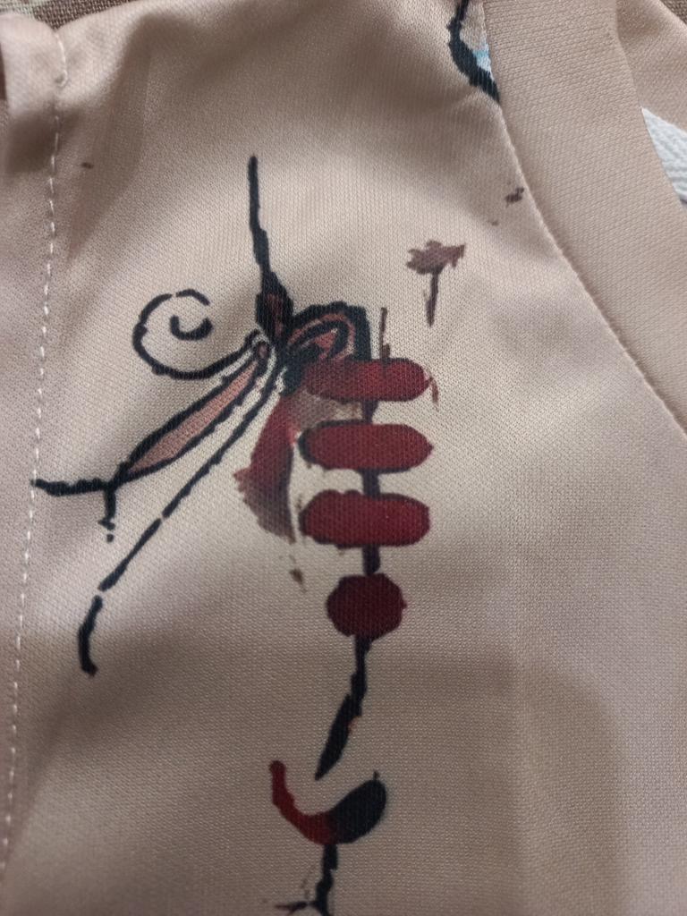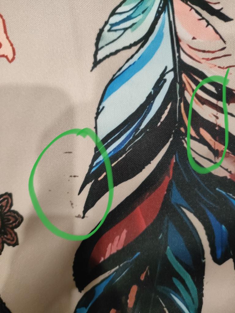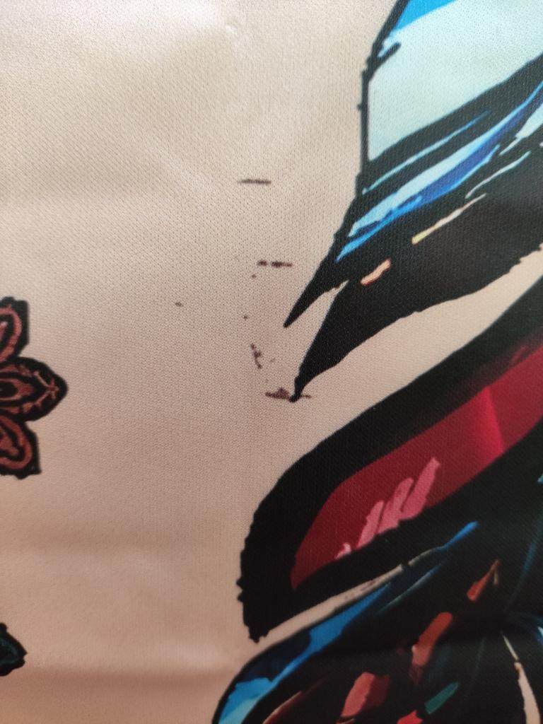 The drawing is smeared, as if it was splattered. Synthetic, poor quality