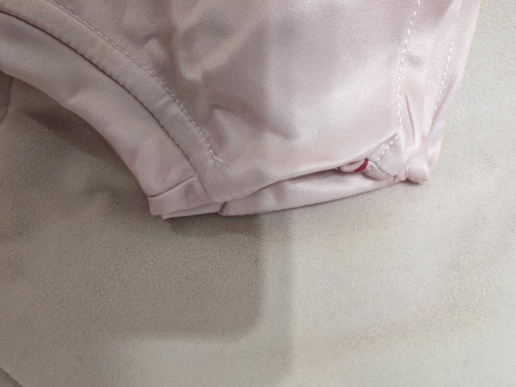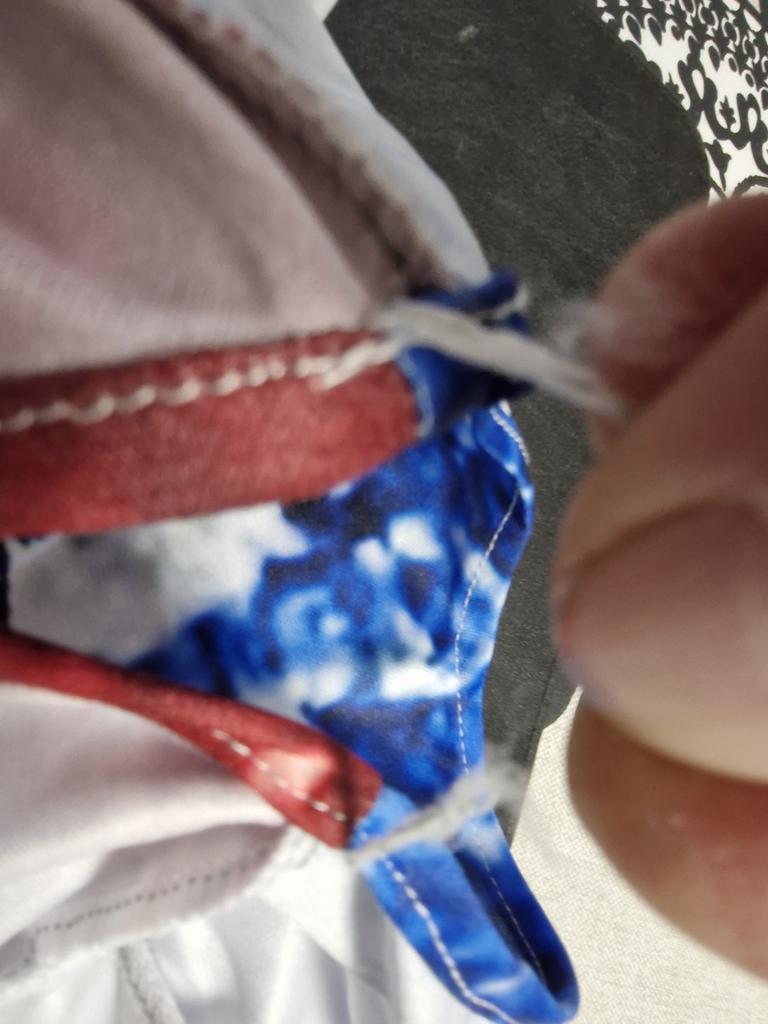 Sewn sloppily, white threads stick out