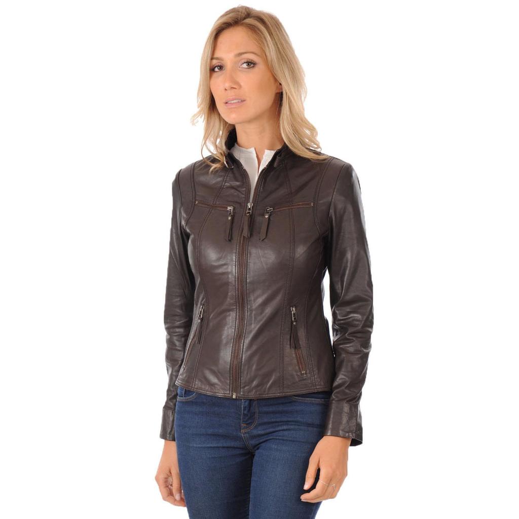 SKINOUTFIT Womens Leather Jacket Real Lambskin Biker Motorcycle Brown Slim Fit Ladies Coat