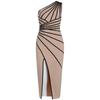 This alluring dress features a striking one-shoulder design, enhanced by a sophisticated striped pattern. Crafted from high-quality knitted material, it offers both style and comfort. The dress includes a chic bandage silhouette that accentuates your figure, while a daring slit adds a touch of drama, making it perfect for a night out or special occasion.