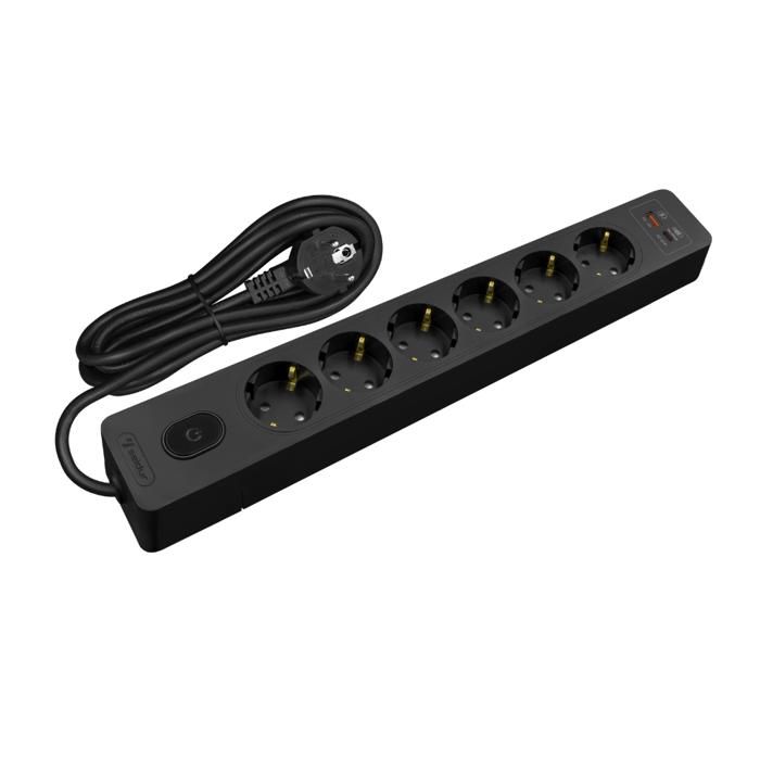 SELDUR G6TH52S Power Strip, 6 Type F Sockets + Switch, USB A+C Fast Charge 20W, Black, 5m Cable