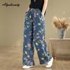 Plus Size Summer Women Tencel Jeans High Waist Floral Print Contrast Color Pants Casual Loose Vintage Ladies' Thin Jeans