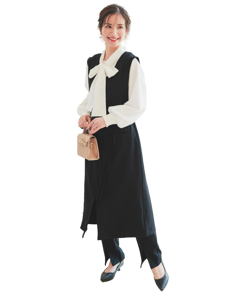 Introducing a versatile 5-piece suit that is easy to wear not only for ceremonies such as kindergarten entrance and graduation ceremonies, shrine visits, and Shichi-Go-San festivals, but also for daily wear. A gilet that can be worn in two ways, either as a cover-up or as a dress, emphasizes the vertical lines and creates a slimmer look. The blouse has a peplum silhouette that naturally covers the area around your stomach. Furthermore, the set includes a big collar and bow tie, so you can use it to suit the occasion and your preference. Straight pants with a beautiful silhouette The elastic back makes them comfortable to wear. I love that it's so comfortable that you won't get tired even if you wear it for long periods of time.