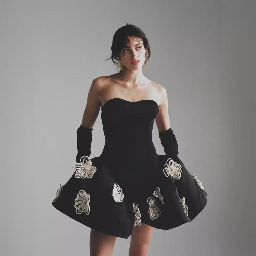 Women's French Hepburn Style Tube Top Tutu Skirt Dress with Black Floral Bandage Design - New Model