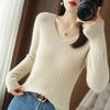 VEZFAA Women's Fashion Casual Fall Winter Solid Color Print Long Sleeve V-Neck Sweaters