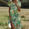 Fashion Womens Loose Floral Print Print O Neck Short Sleeve Leaves Print Loose Streetwear A-line Dress
