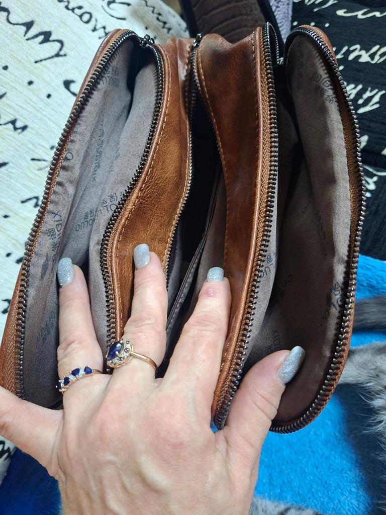 The bag is as in the photo, the order took 6 weeks, the packaging is excellent (bubble wrap, bag, plus a cloth bag and an air-filled pouch inside for shape). There is no smell, the bag looks medium-sized, but the three compartments are very spacious. The gift was a nice surprise. I recommend for purchase.