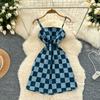 Summer Women Vintage Spaghetti Strap Designer Plaid Denim Party Mini Short Dresses