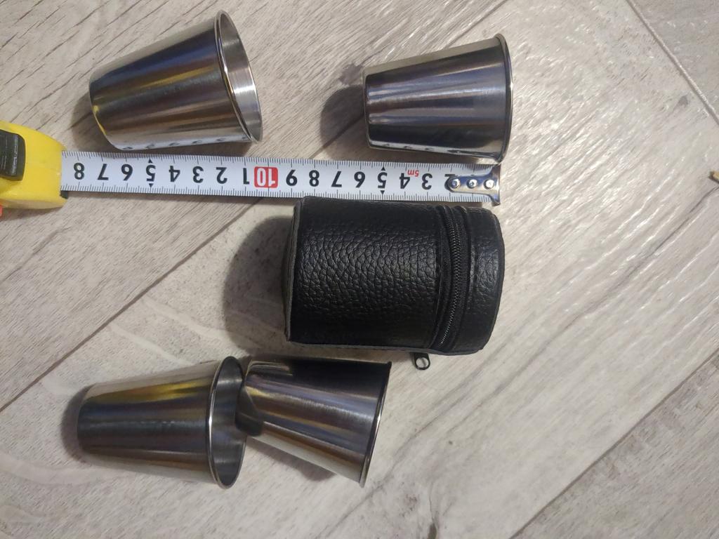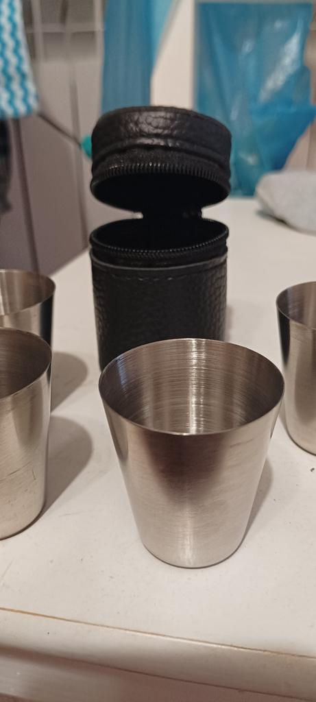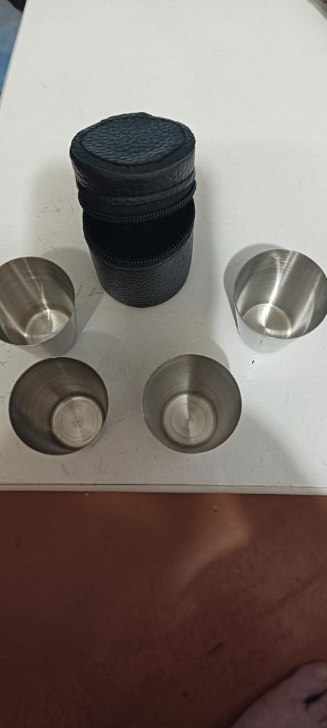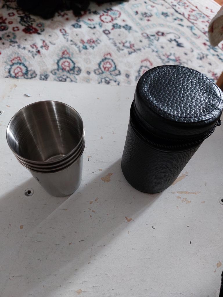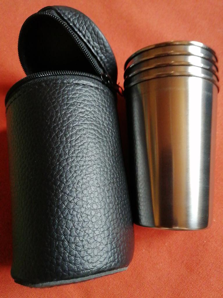 Great for fishing/hunting/picnics, stainless steel, neat, in a case. You won't break them or cut yourself. Just hope they don't freeze to your lips in the cold, so the drinks should be stronger.