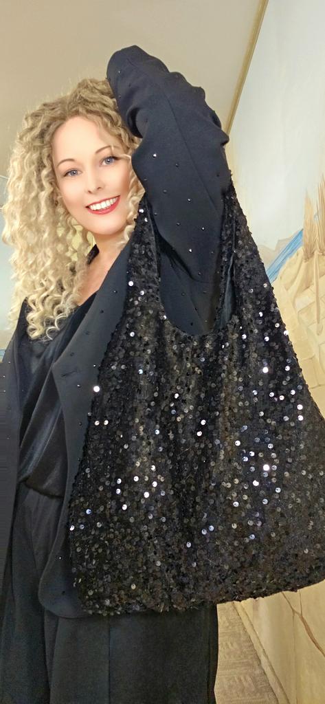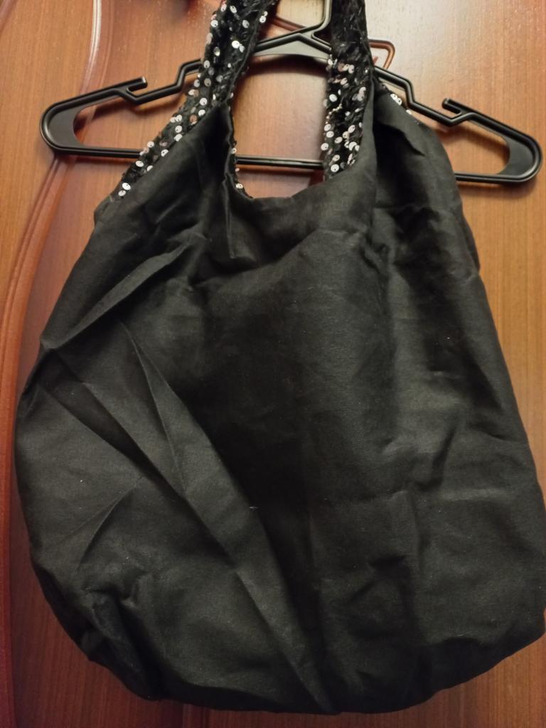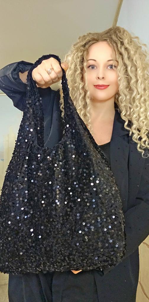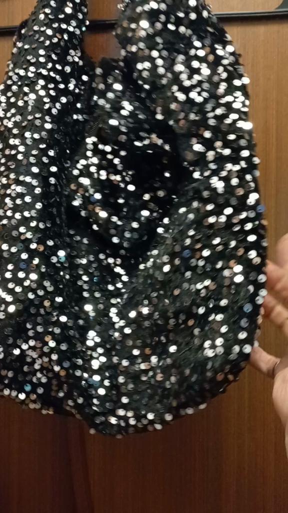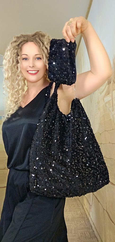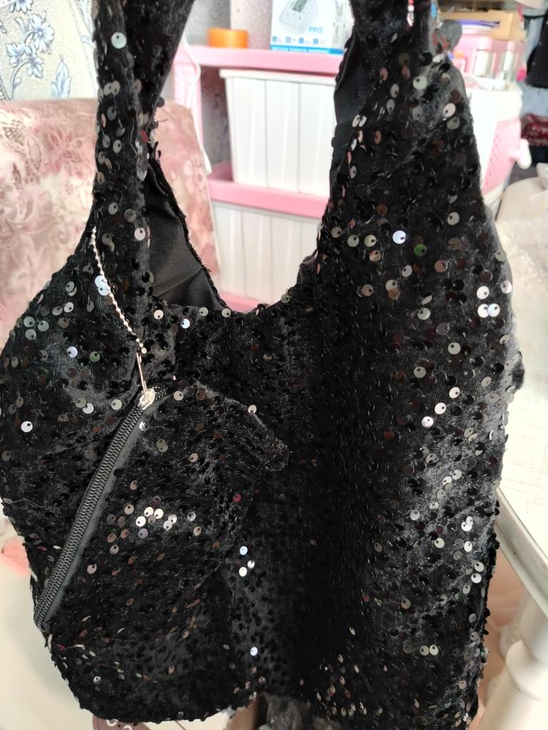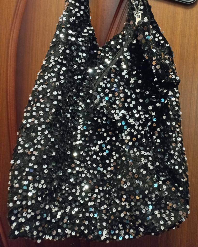 Sequin tote bag โจ๏ธโจ๏ธโจ๏ธ Bright, black, the sequins are also black, firmly sewn onto velvet fabric. The bag is lined, but without a clasp and internal pockets. A zippered wallet is attached to the strap by a chain. A replacement for a pocket)) Lightweight, comfortable to wear over the shoulder. Looks cool and spacious when filled with things.. For summer, it will be suitable as a light handbag)) I highly recommend it ๐งก