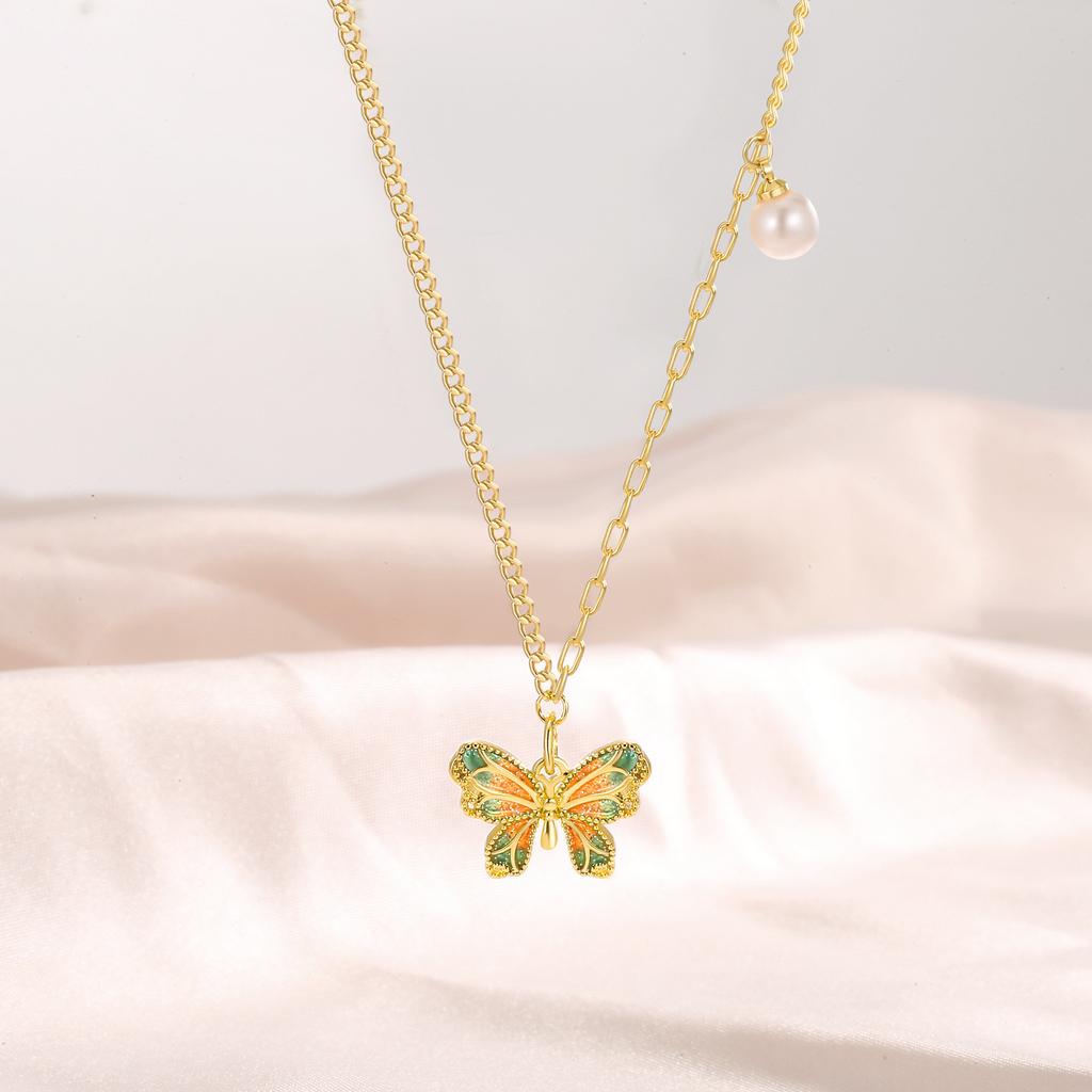 Enamel Oil Drop Butterfly Necklace Women's Light Luxury High Sense New Chinese Style Gradual Change Color Pendant Pearl Collarbone Chain