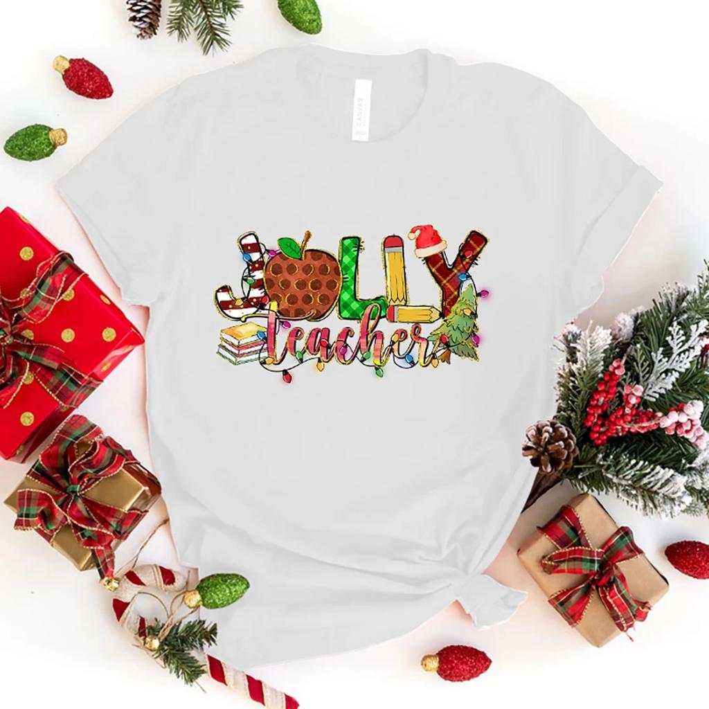 Funny Christmas Jolly Teacher Letter Printing T-Shirts For Women Summer Tee Shirt Femme Casual Short Sleeve Round Neck Tops
