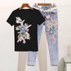 Women's Summer Personalized Set Design Embroidery Short Sleeve T-Shirt + Small Feet Hole Breaking Jeans Two Piece Set